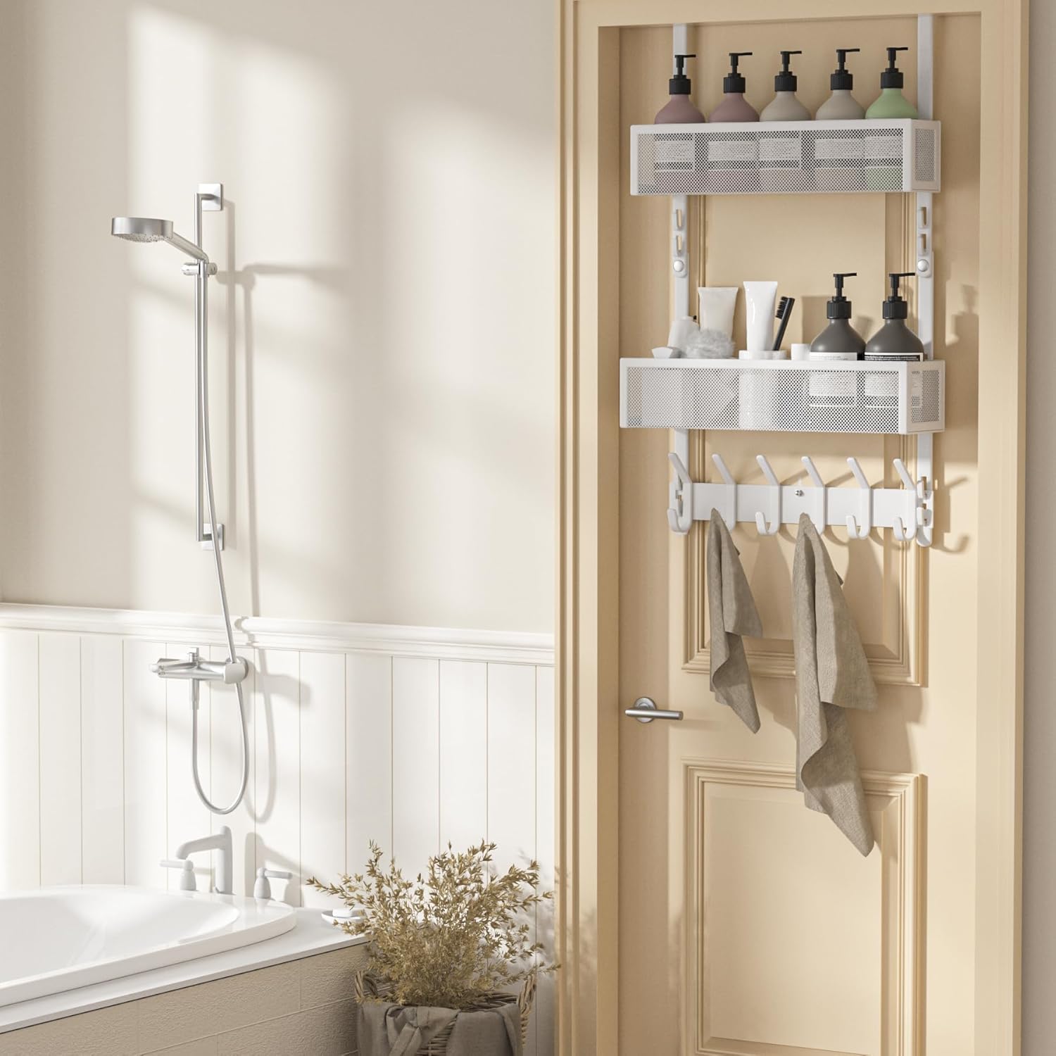 LUCYCAZ Adjustable Over The Door Hooks Organizer, Hanger Storage with 10 Coat Hooks & 2 Mesh Basket, Over The Door Towel Rack Organizer for Bathroom, Bedroom, Kitchen (White)
