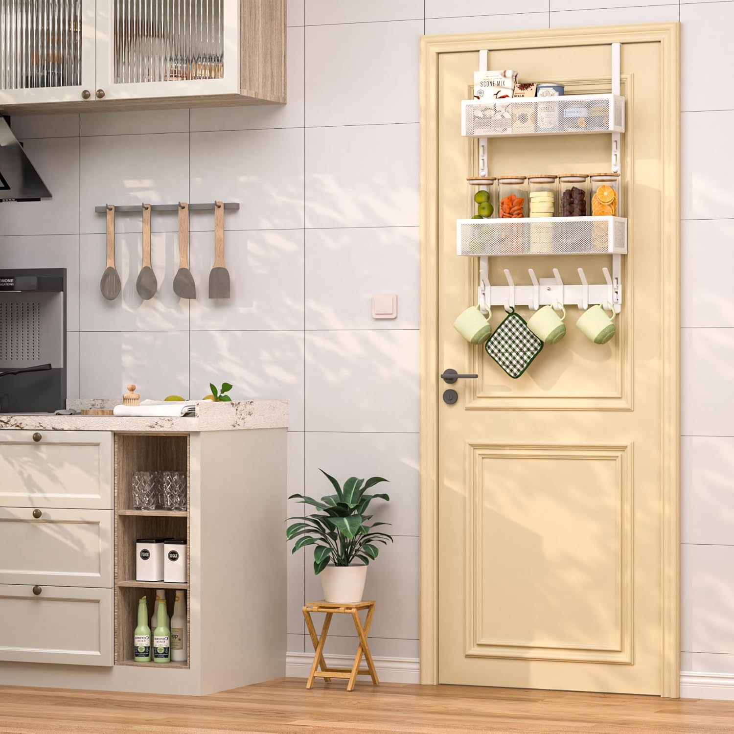 Adjustable Basket’s Height-Over Door Organizer:The height of the over door basket can be adjusted, according to your heights or your other needs to choose appropriate snap position. The over door organizer can be used in the bedroom, kitchen, bathroom , office, room in rv and all other places that can be hung and creates extra storage space.