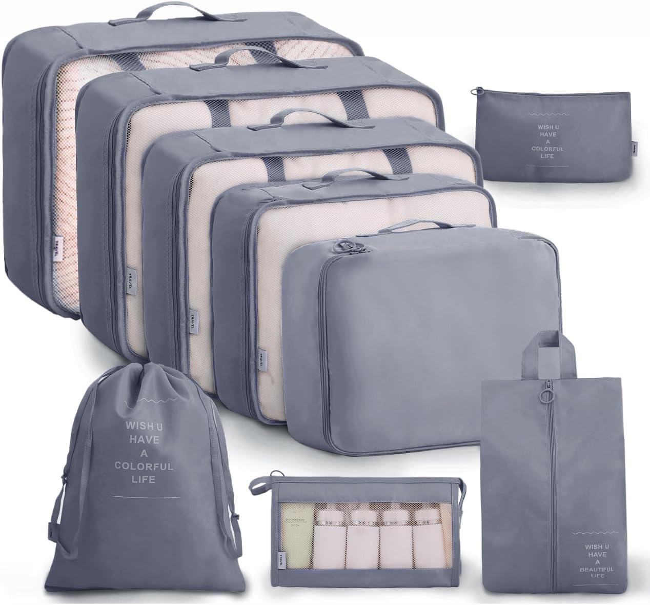Customers find these packing cubes help keep their luggage organized and make traveling easier, with the ability to fit a week’s worth of clothes in one large cube. The design receives positive feedback for its appearance, and customers appreciate the variety of sizes, though some find them smaller than expected. The quality and durability receive mixed reviews, with some customers reporting zippers breaking on first use and bags coming apart at the seams.