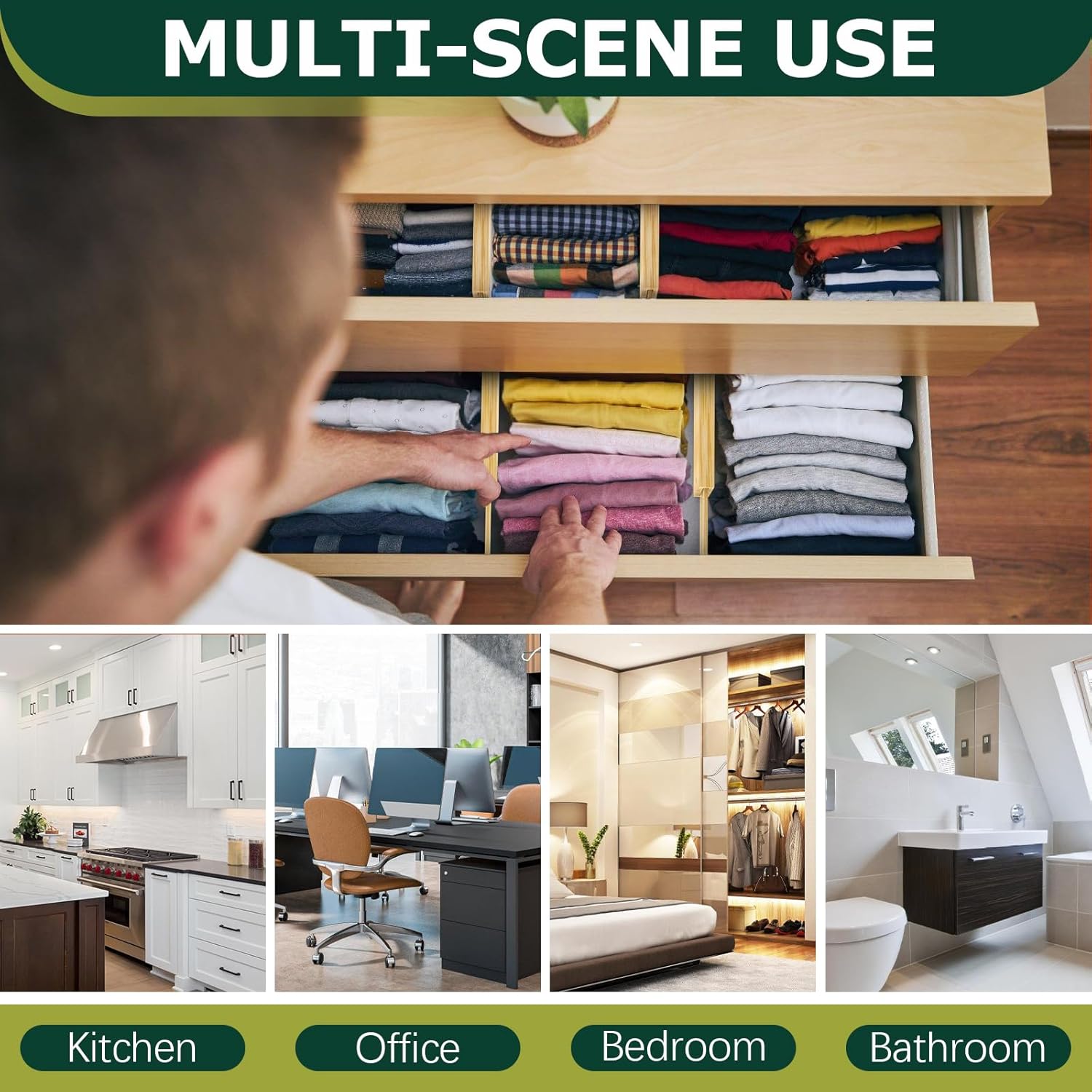 【Widely Used】 These drawer organizers can be installed in any drawer at home or in the office. Perfect for organizing clothes, kitchen utensils, office supplies, cosmetics, bathroom essentials, and more, they help maximize storage space while keeping your belongings neatly arranged and easily accessible