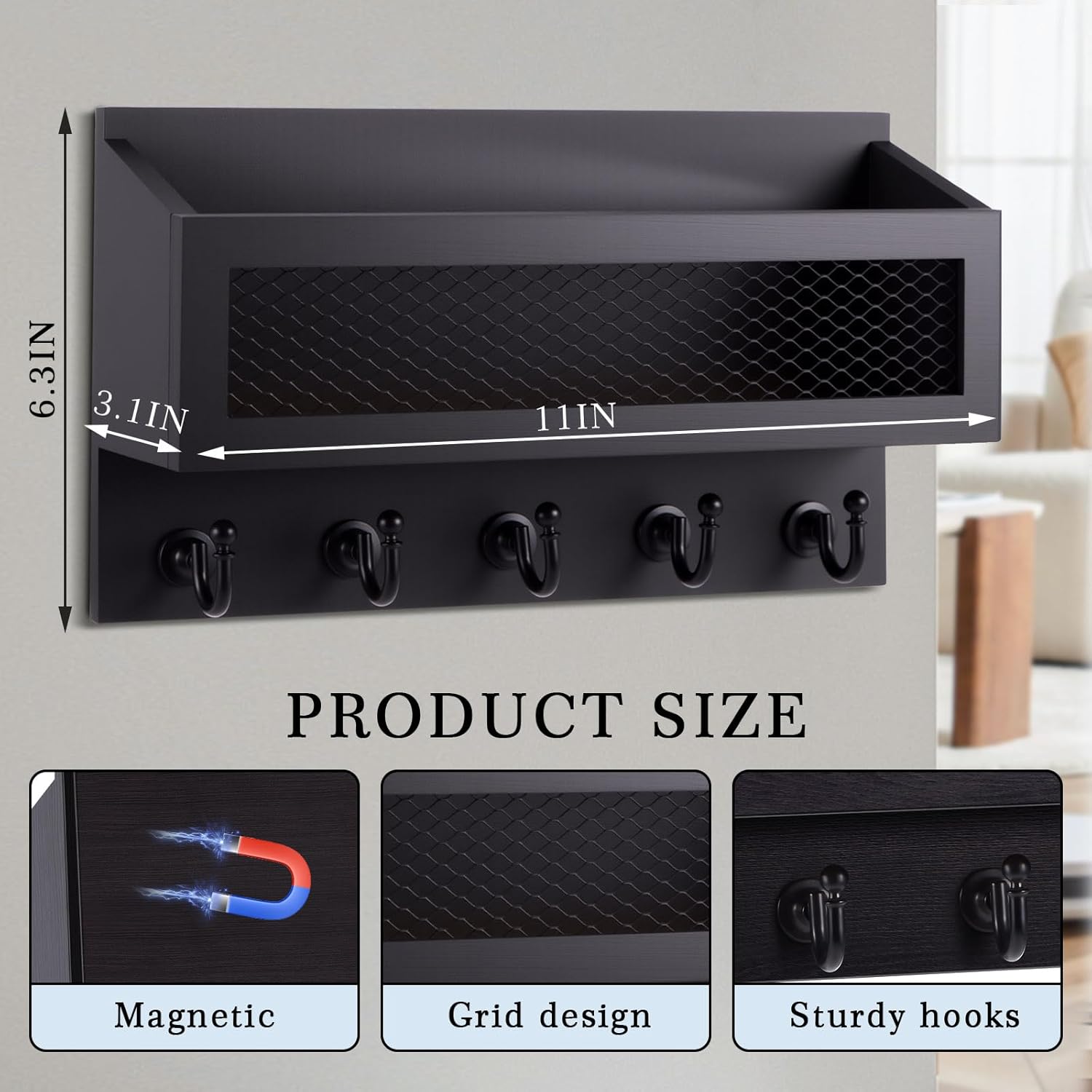Solid Wood Construction: this key holder is crafted from solid wood with a furniture-grade finish; Equipped with five sturdy metal hooks, it can bear up to 22 pounds; Ideal for hanging keys, mail, sunglasses, masks, wallets, dog leashes, etc., its wall-mounted design optimizes and saves space; Never lose your keys or mail again