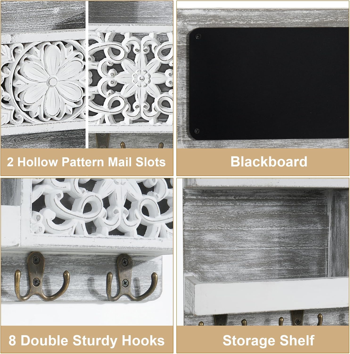 Versatile Wall-Mounted Mail Holder:Featuring 2 hollow mail slots for letters, postcards and magazines, a chalkboard for note-taking, a storage compartment for plants and small items, and 8 vintage-style hooks for keys, dog leashes, clothes, and bags