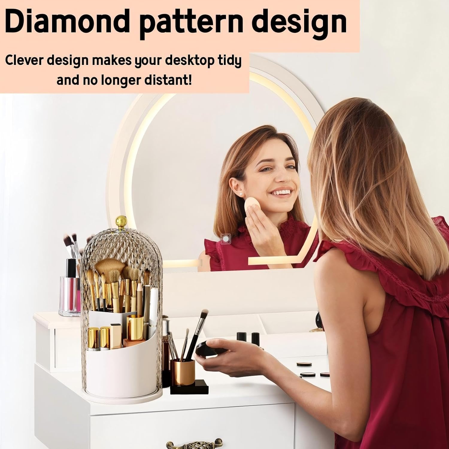 Makeup Brush Holder with Lid,Makeup Brush Storage Box with Diamond Pattern,360 Rotating Waterproof and Dustproof Beauty Brushes Storage for Vanity Bathroom,White