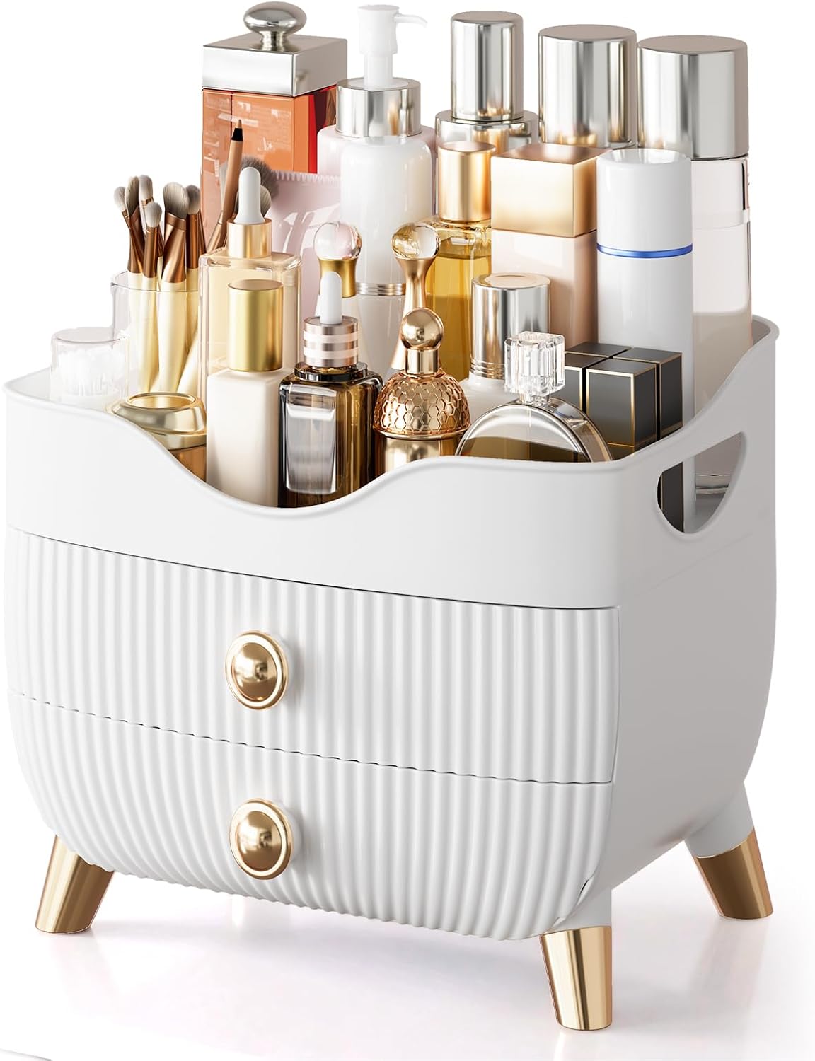 ⨠Elegant Modern Style: The rounded appearance design and delicate golden drawer handle with non-slip feet make the cosmetics organizer unique and elegant, bringing you an elegant home.
