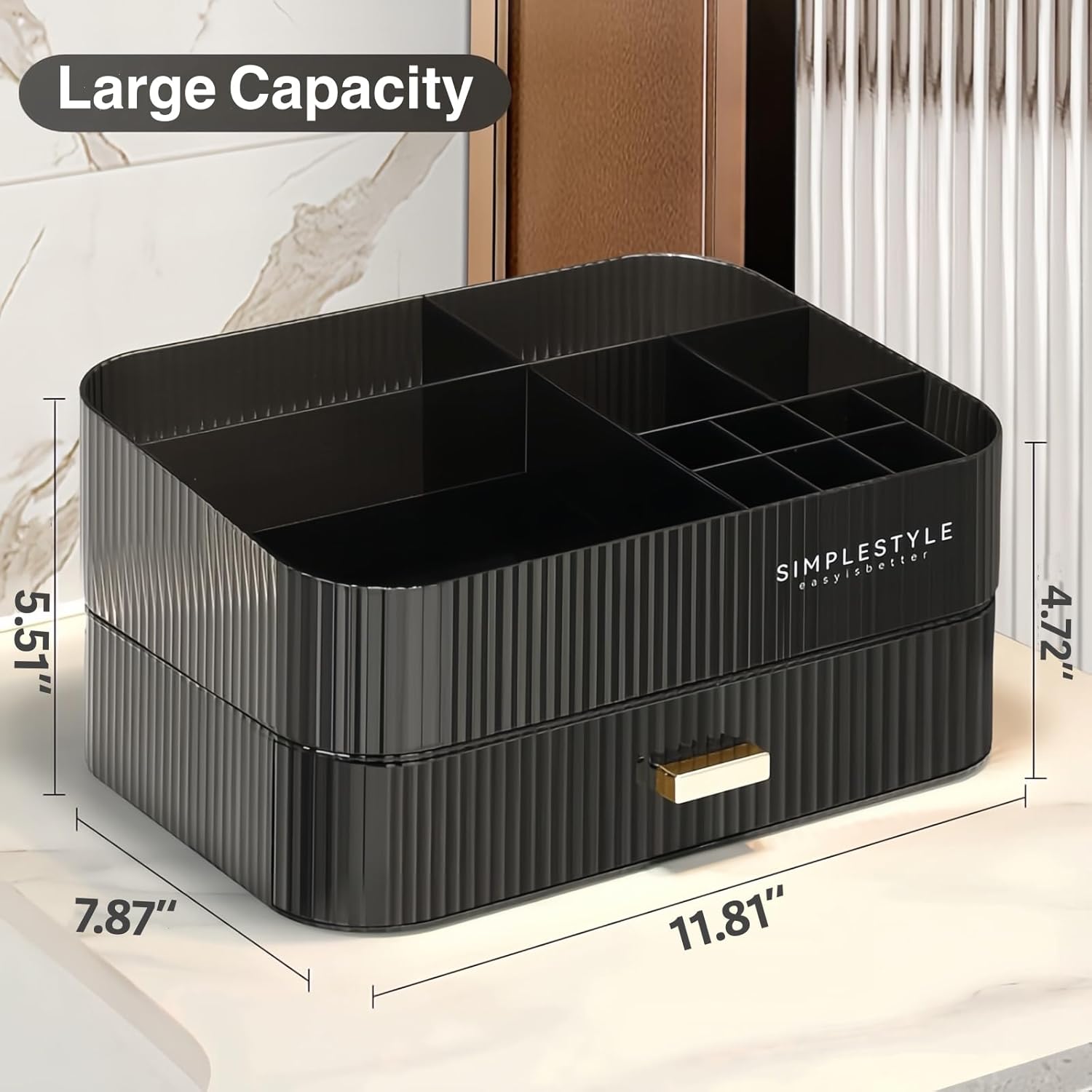 Makeup Organizer for Vanity, Large Desk Organizer with Stackable Drawer for Cosmetics, Skincare, Lipsticks, Palette, Nail Care, Ideal Storage for Dresser and Bathroom Countertop- Black