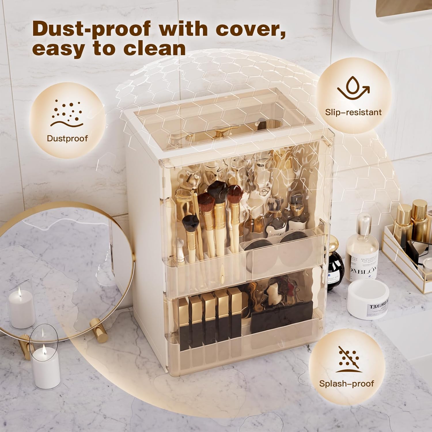 Dustproof & Waterproof Protection :Makeup Organizer keeps your makeup safe from dust, moisture, and splashes! Ideal for use in bathrooms, this organizer helps maintain your beauty products’ clean and well-preserved.