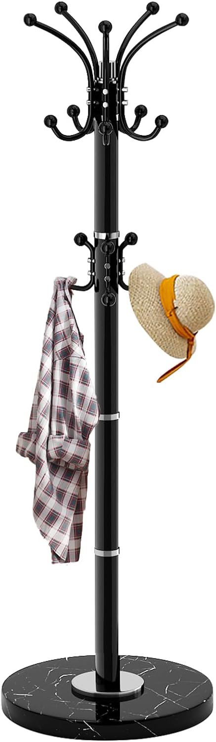 100% NATURAL MARBLE BASE: This coat rack freestanding is made of 100% natural marble. Carefully selected natural marble, each piece has a unique vein carved by nature (not a quality issue). This marble base coat rack is capable of supporting 180LBS, hanging heavy winter coats and briefcases very firmly without wobbling