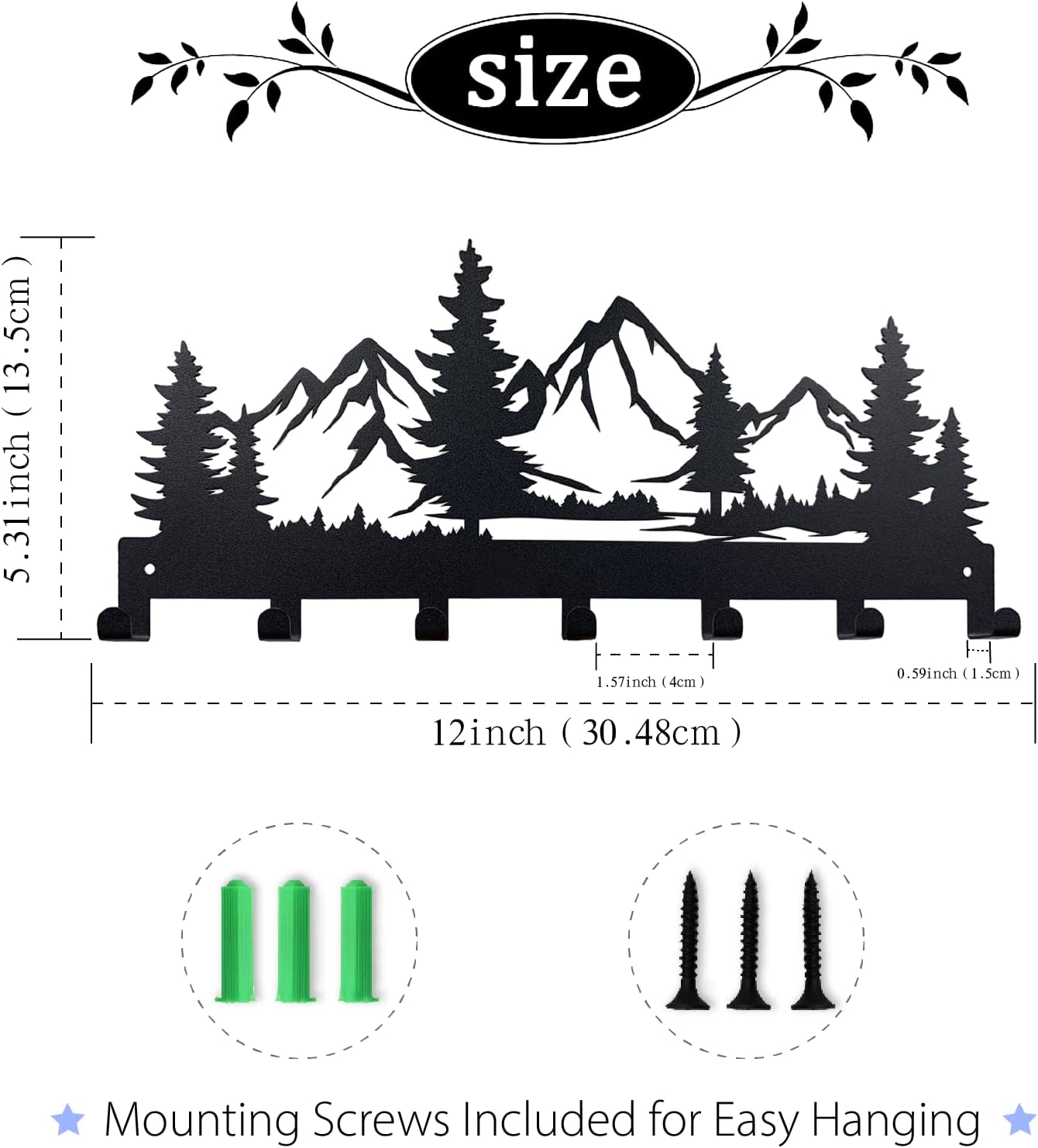 Metal Key Holder, Wall Mounted Key Hooks, Key Holder for Wall, Key Organizer Rack with 7 Hooks, Key Hanger Decor for Kitchen, Entryway, Hallway, Bedroom, Doorway (Mountain 12IN)