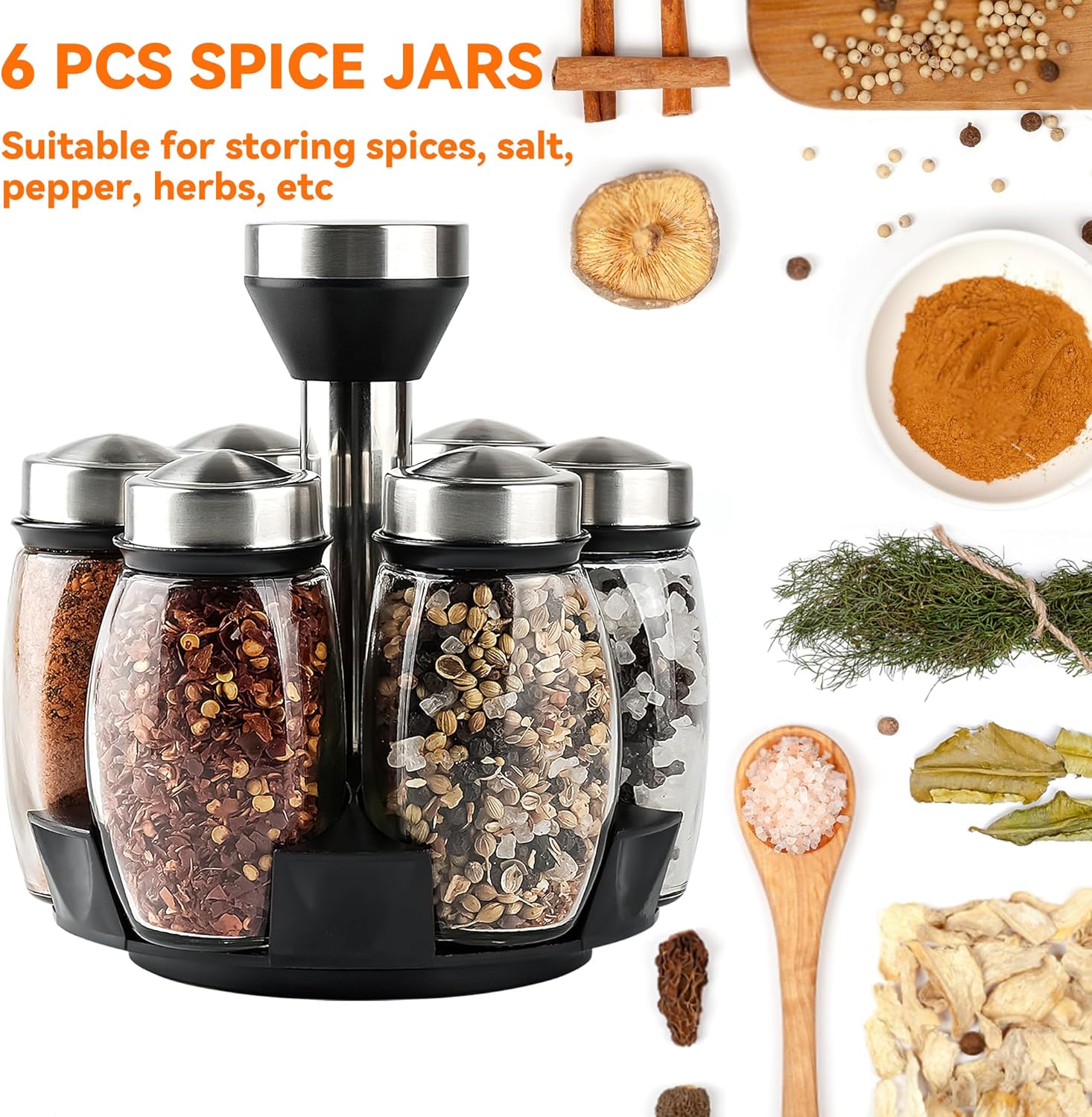 High Quality Seasoning Rack: The spice jar set consists of 6 glass bottles and 1 stainless steel rack. Spice bottles are made of high-quality food-grade lead-free glass. The rotating stand is made of stainless steel and the base is made of ABS plastic, which is sturdy and durable. Please Note: Our spice rack does not contain spices