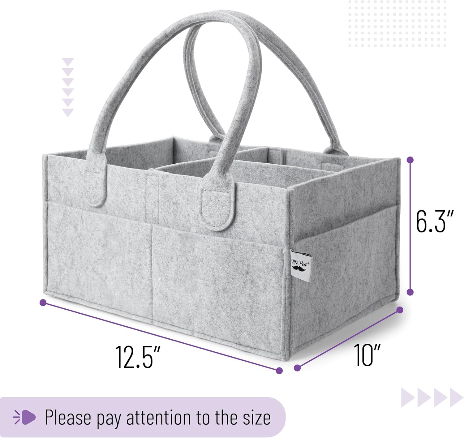 Mr. Pen baby diaper organizer measures 12.5 x 10 x 6.3 inches and offers ample space and compartments for easy access to all baby essentials.