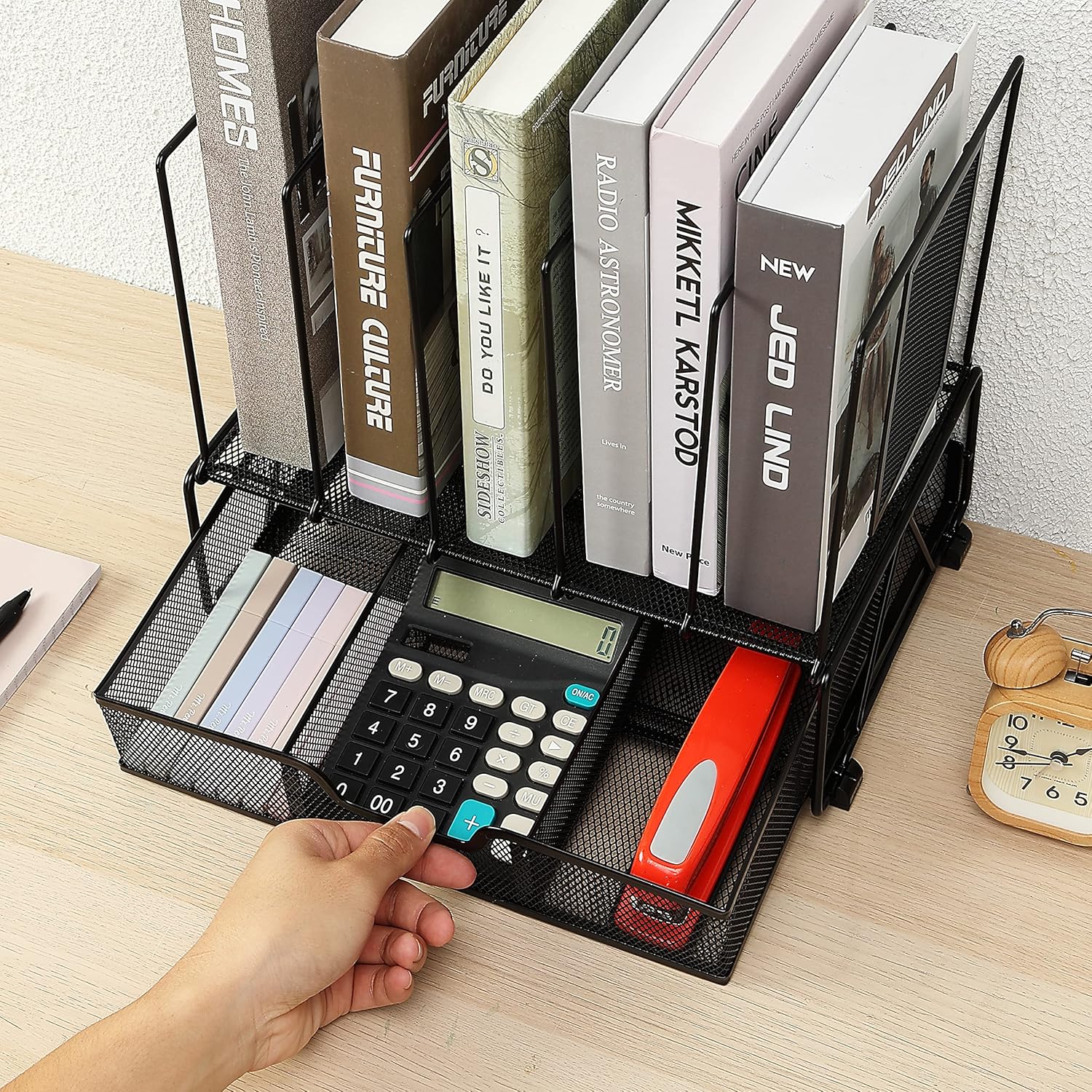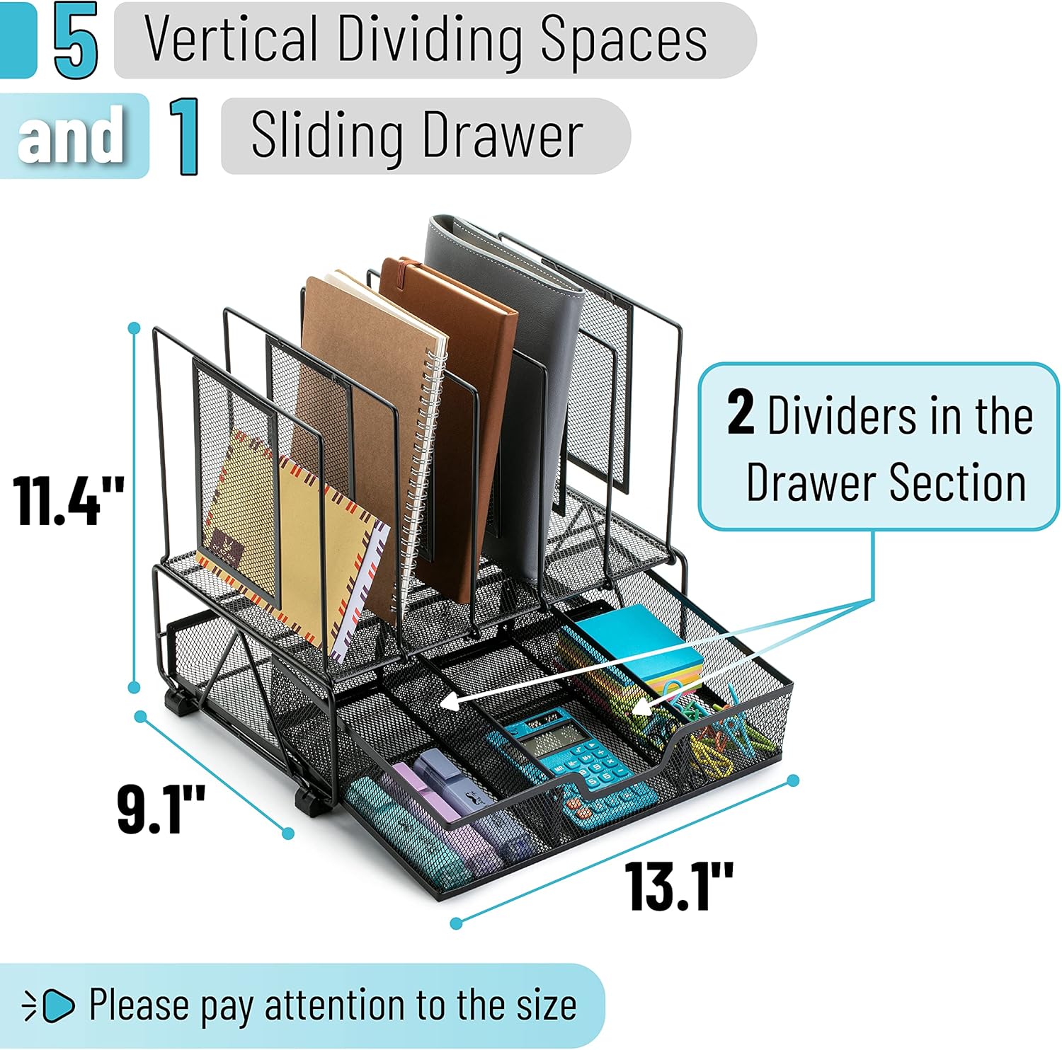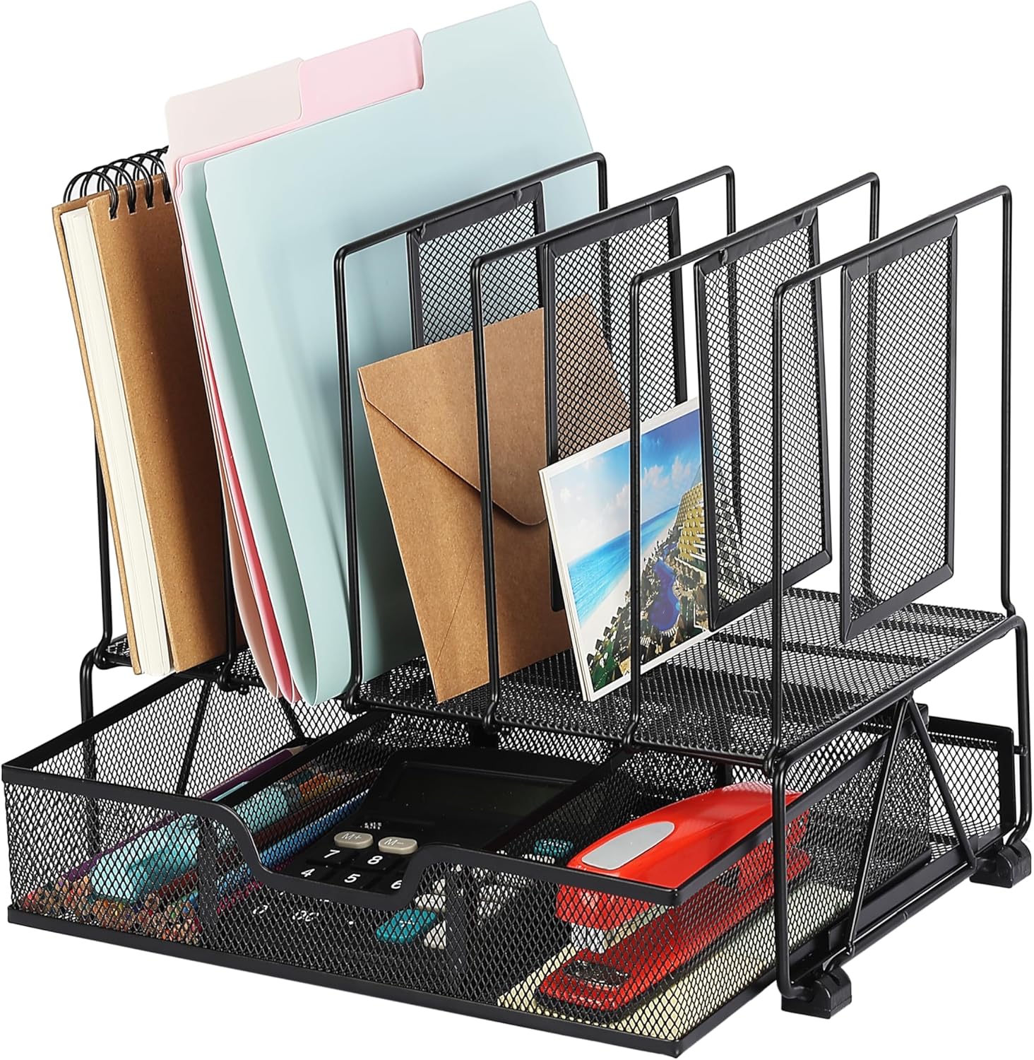 Our mesh desk organizer has 5 vertical file sorter spaces and 1 sliding drawer with 3 compartments for sorting and storing. This mesh desk organizer lets you put away your desktop goods and makes keeping your office stuff easy.