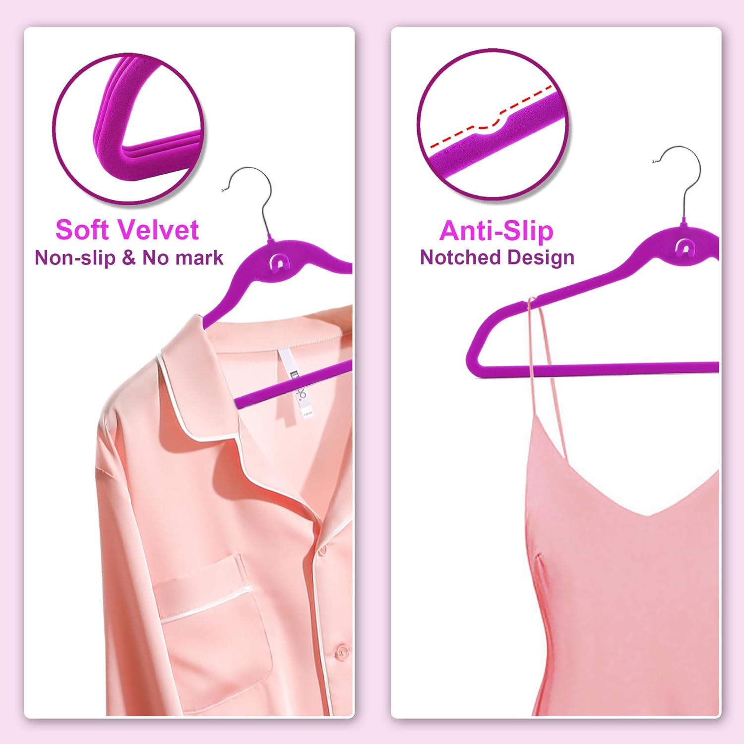 Non-slip velvet prevents clothes from slippingIdeal for hanging delicate fabrics like silk or satinKeeps garments securely in place, even on slim or lightweight clothing