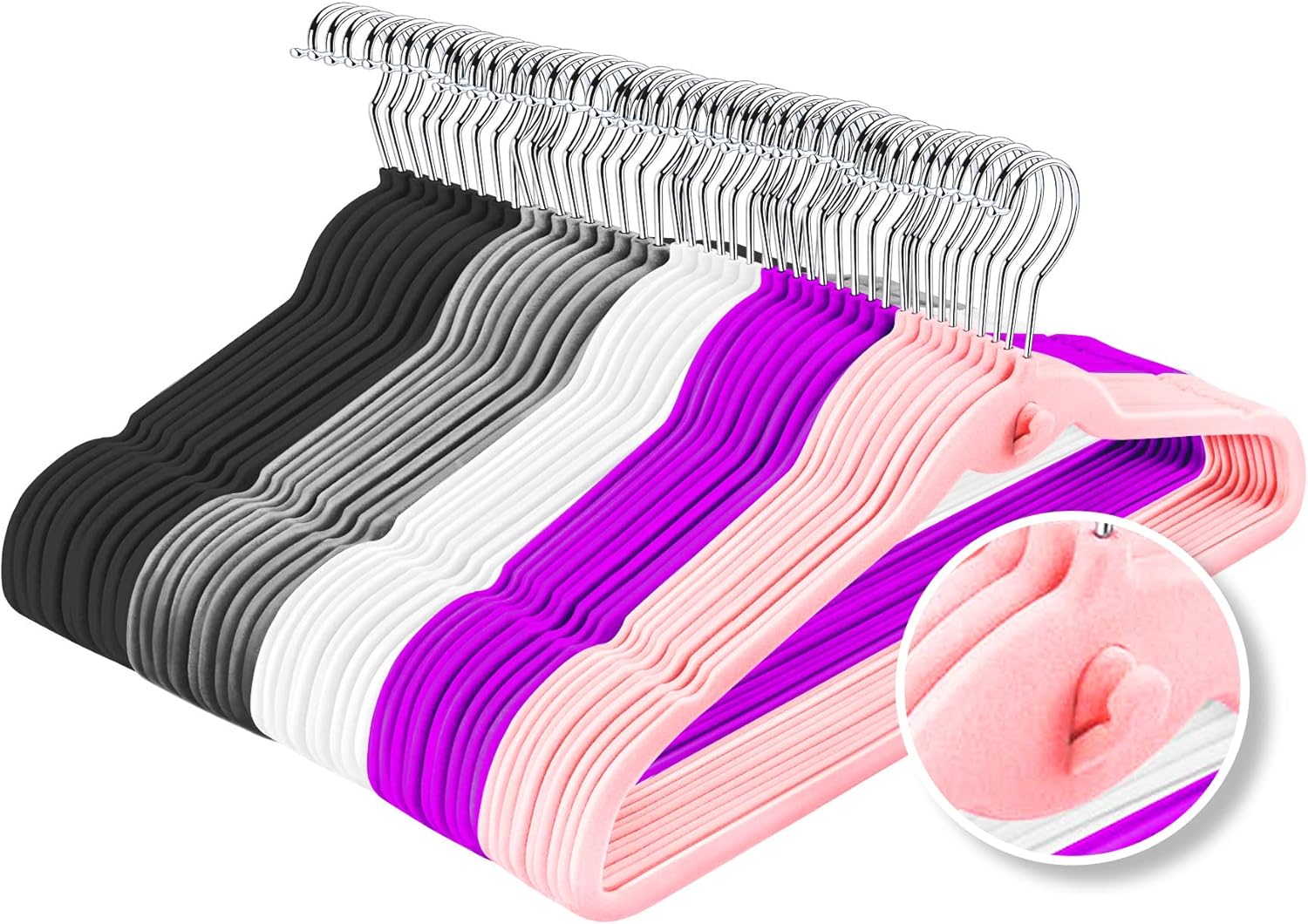 Multi-Color Velvet Hangers 50 Pack with Cascading Hooks, Non-Slip Black, Pink, White, Grey, and Purple Velvet Hangers for Clothes, Suits, and Coats