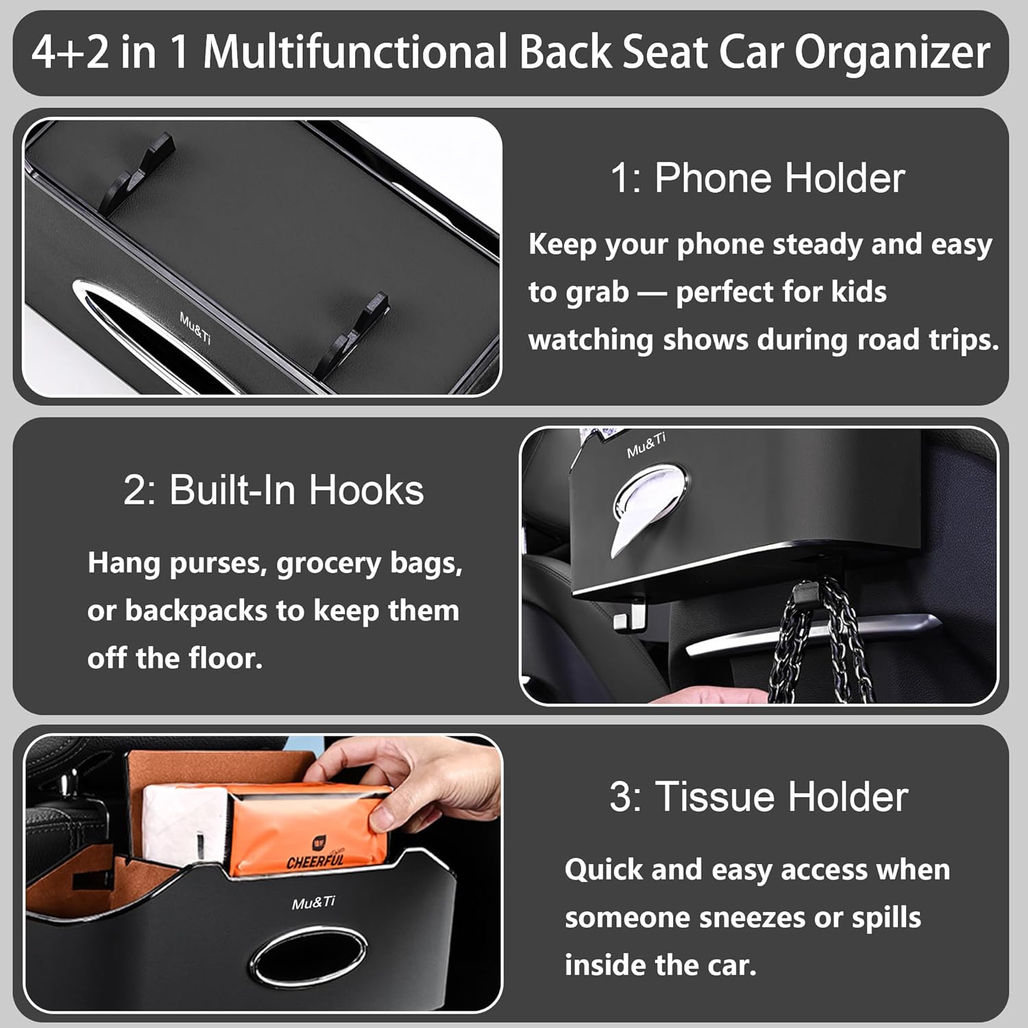 4-in-1 Functionality, Convenient Use: This seat organizer features multiple storage options, including 2 cup holders, cell phone stand, a tissue box, and several hooks. It neatly stores water bottles, snacks, toys, wipes, tissue, umbrellas, and more, making your items easy to access.
