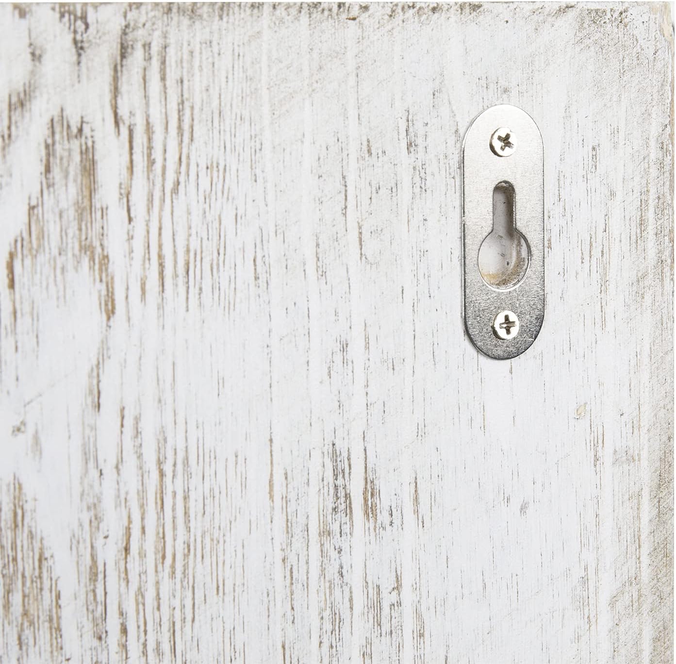 Wall mounted shelving unit is crafted of solid wood in a shabby chic white weathered finish for a farmhouse aesthetic that complements a wide range of décor