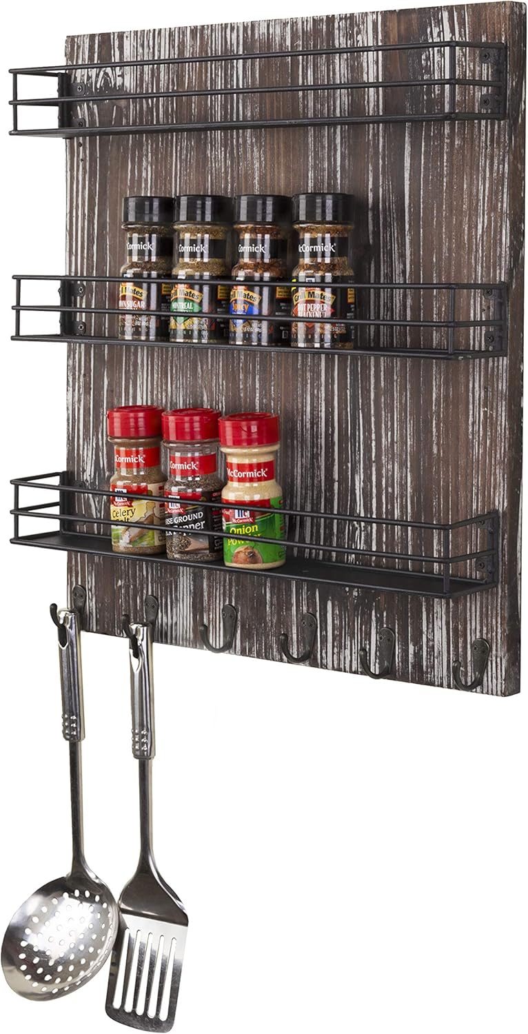The torched wood finish combines with black metal wire to bring a rustic look and add a touch of a farmhouse accent. This spice rack blends the storage function and distinctive style while complementing your country-themed decor.