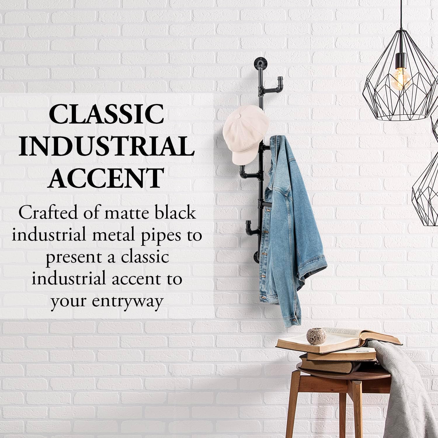This wall mounted hat rack is crafted of durable metal in a decorative pipework design with a modern matte black powder-coat finish