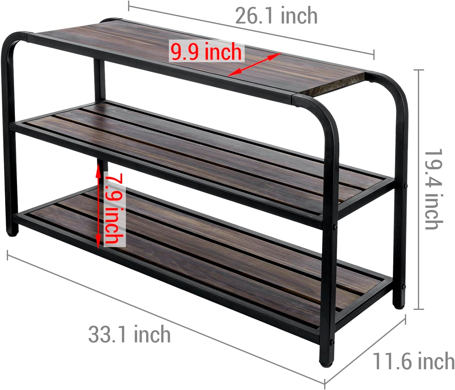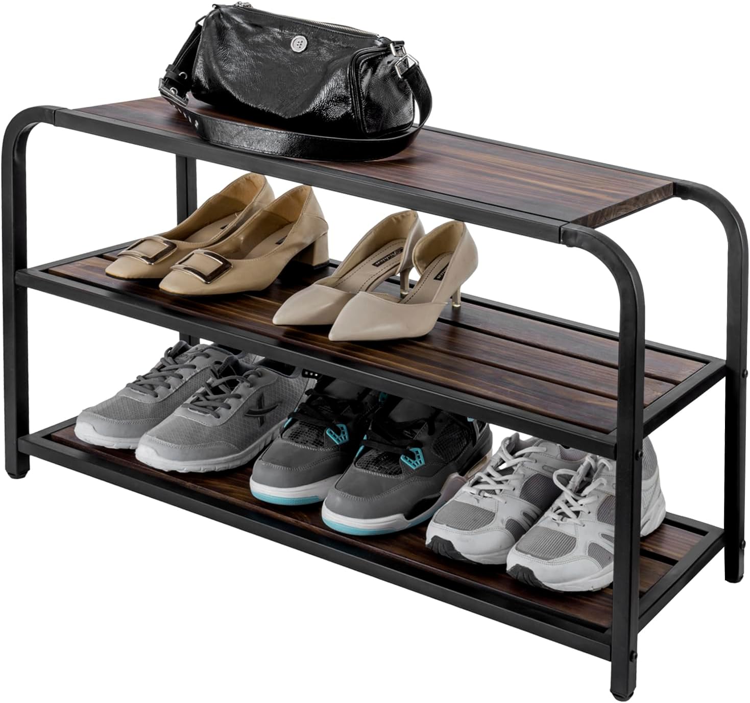 Keep your shoes neatly organized and easily accessible when leaving or entering your home with this 3-tier burnt solid wood and matte black metal freestanding shoe bench. Featuring three tiers, each shelf can hold up to 3 pairs of shoes, for a total of 6 pairs of sneakers, boots, high heels, sandals, or tennis shoes. You can even use the top shelf for even more shoes storage, for handbags, or a place to sit while putting on your shoes.
