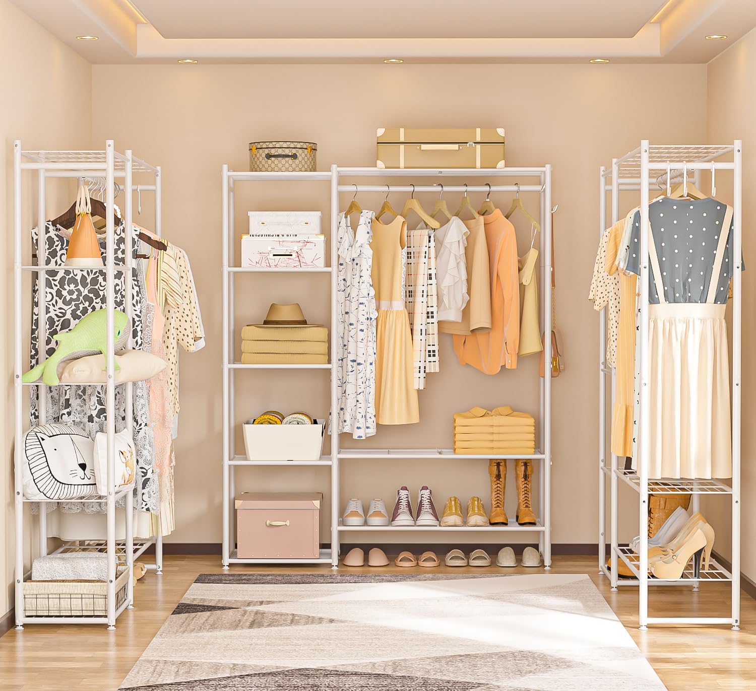 Neprock Clothing Racks for Hanging Clothes with Shelves, Portable Closet System Organizer Garment Rack for Clothes Storage, Metal Free Standing Wardrobe Clothes Organizer(White)