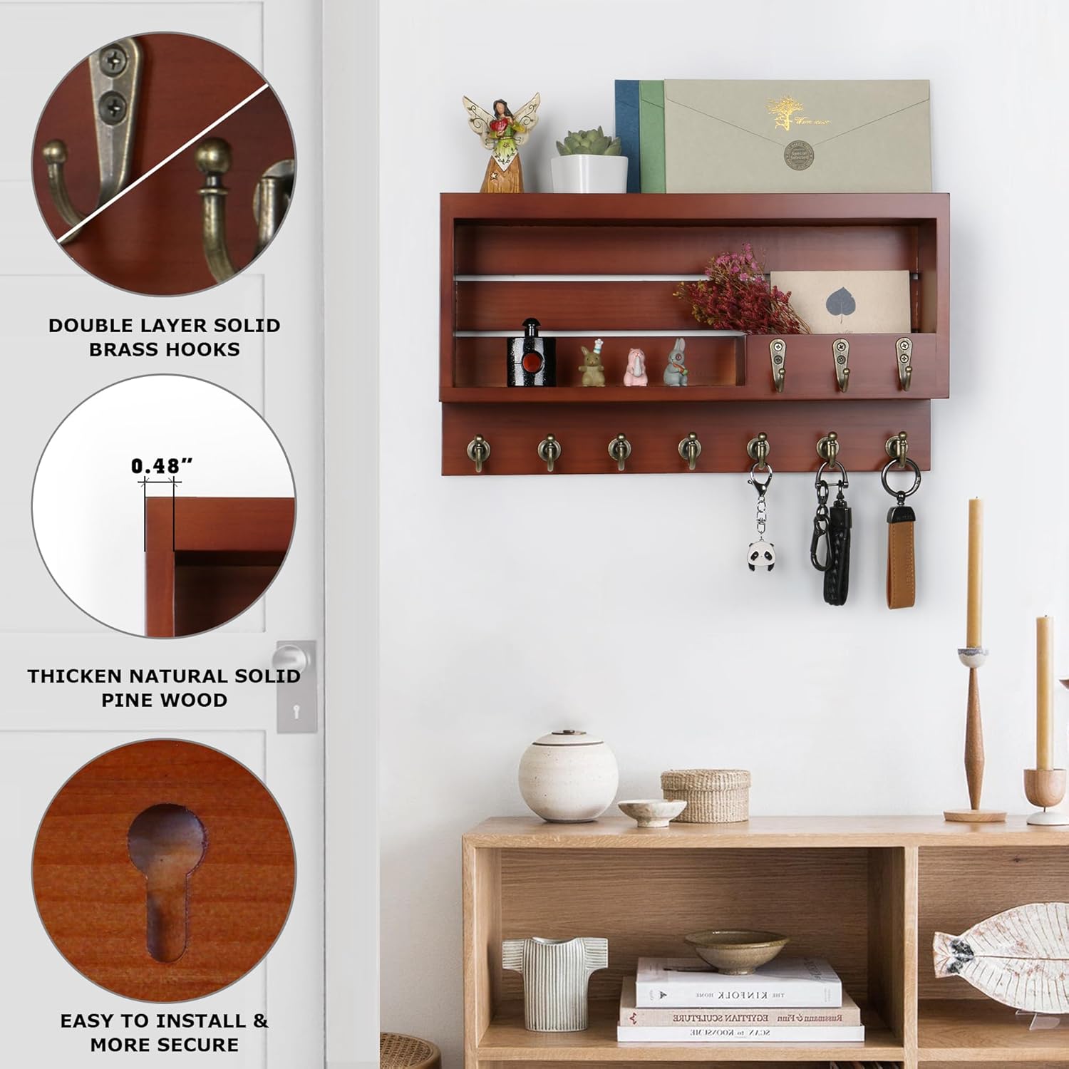 Each key holder wall mount is carefully designed by us, with smooth lines and strict quality inspection control. It can be perfectly integrated into your entryway, hallway, kitchen, bedroom, living room and office.Exquisitely crafted solid wood key holder for wall brings a high-end and elegant enjoyment to your home decor.