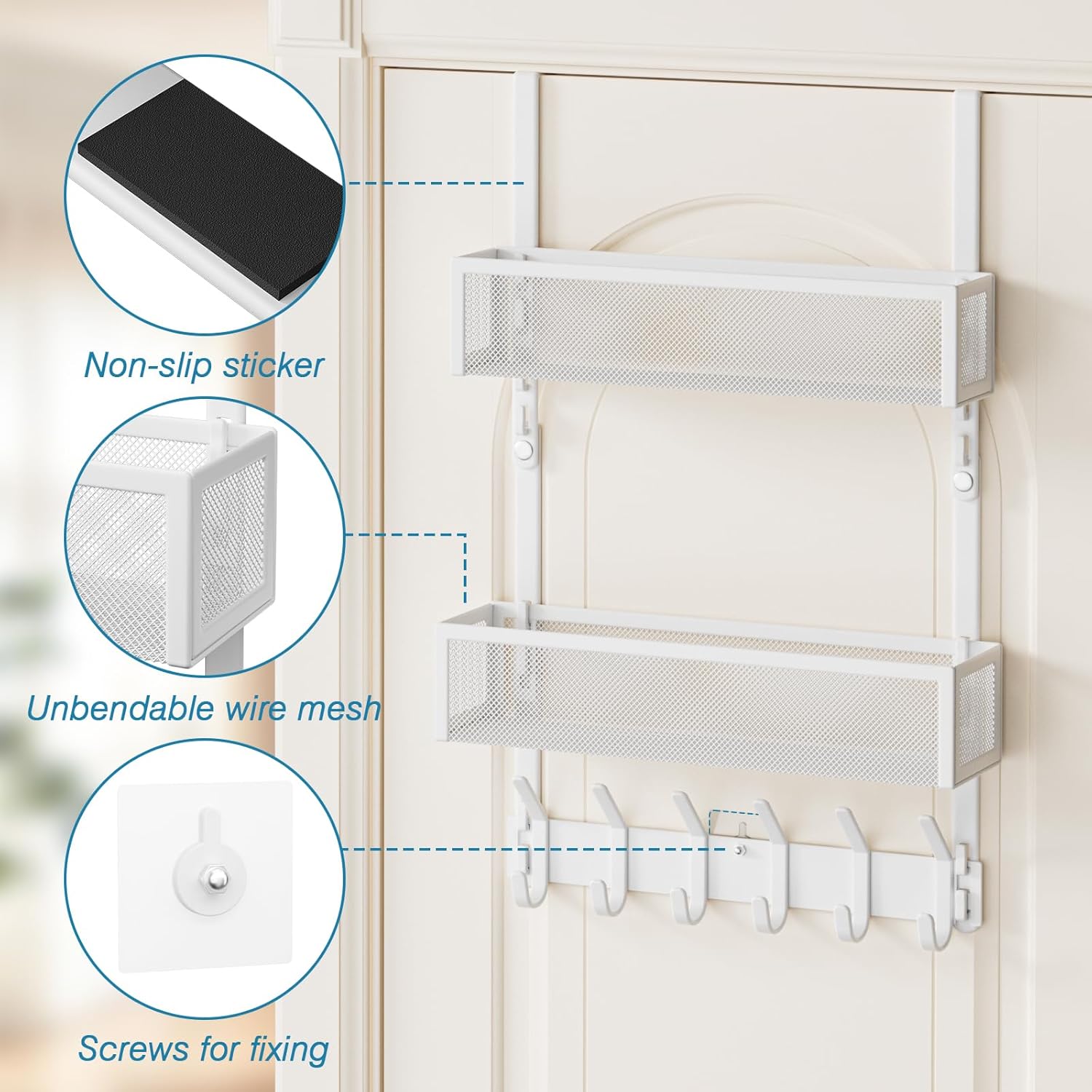 【Premium Material】This over the door hooks made of premium quality stainless steel, the over the door hanger is sturdy and long-lasting. Comes with matte finish , the appearance is simple and stylish look. This over the door organizer has two dense basket, you can better store keys, pens or other small items. 12 flat hooks prevent clothes from being scratched, ideal for hanging your bags,coats, towels.