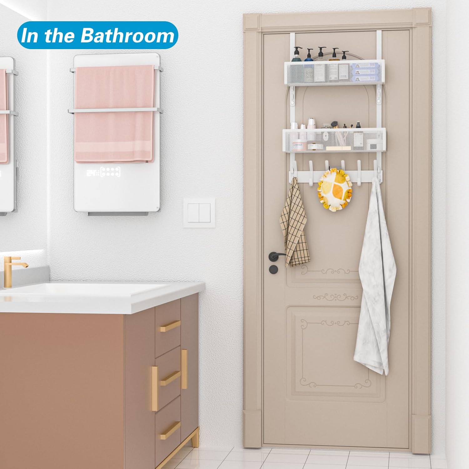 Over The Door Hooks Organizer, Over Door Storage with 12 Coat Hooks and 2 Mesh Basket, Bathroom Door Organizer Towel Rack Back of Door Hanger Organizer for Bedroom, Kitchen(White)