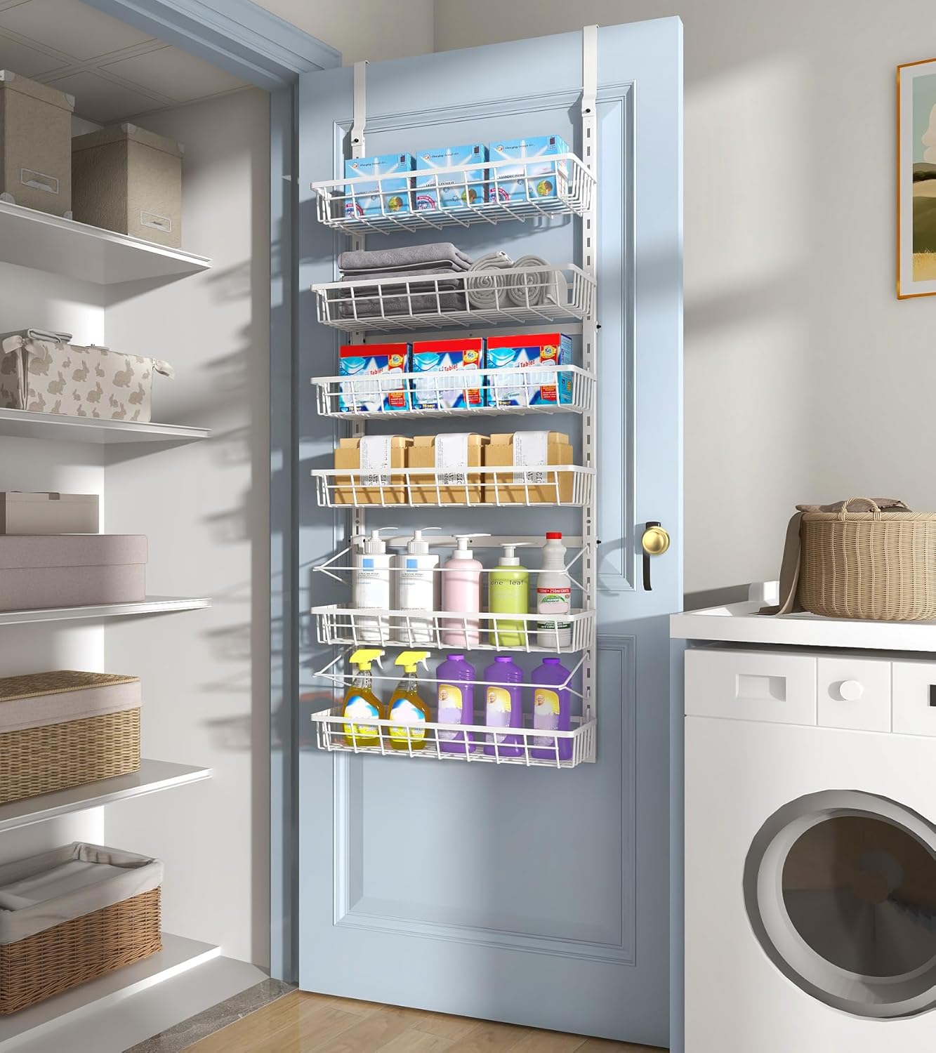 Over The Door Pantry Organizer, Wall Mount Spice Rack, Pantry Hanging Storage and Organization, 6 Adjustable Baskets Heavy-Duty Metal for Home & Kitchen, Back of Door Seasoning Rack – White