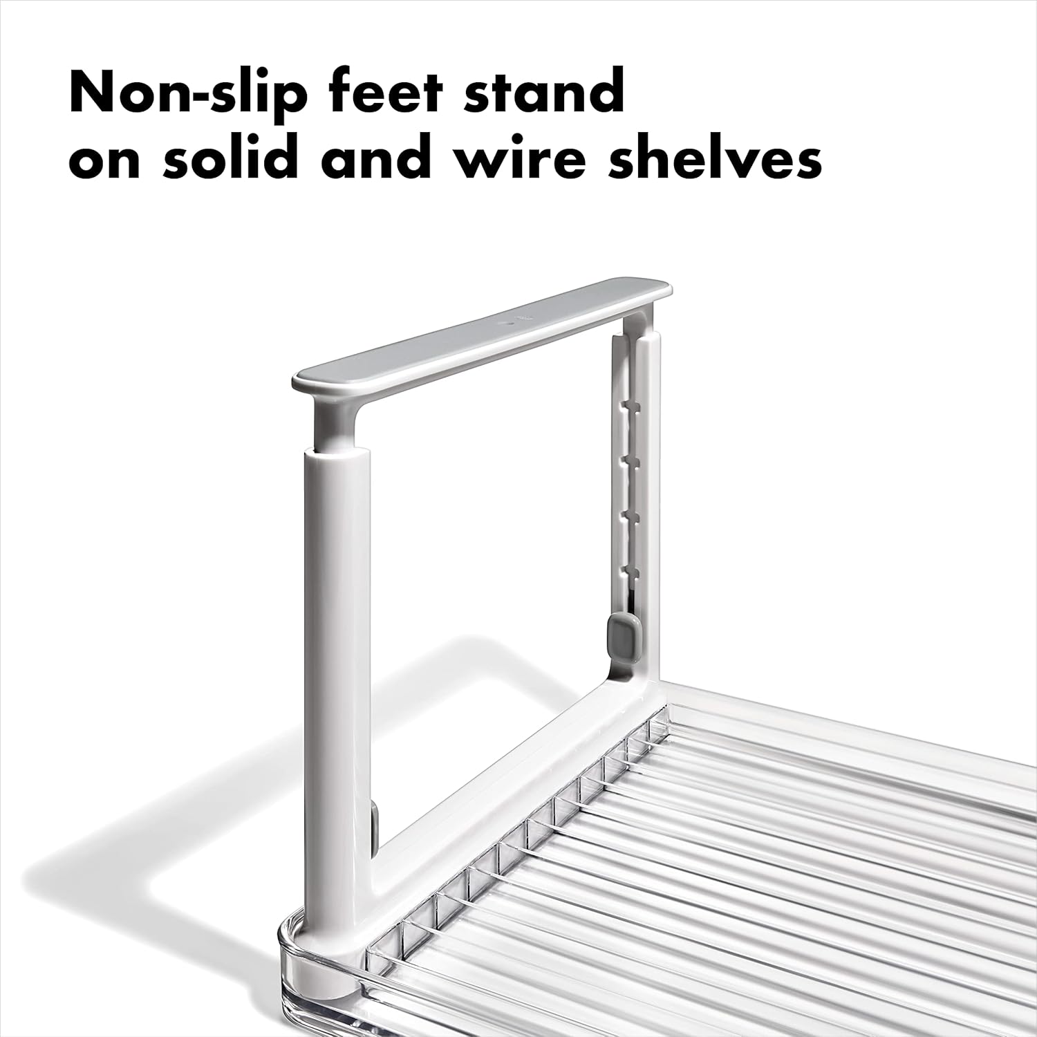 Non-slip feet stand securely on solid and wire refrigerator shelves