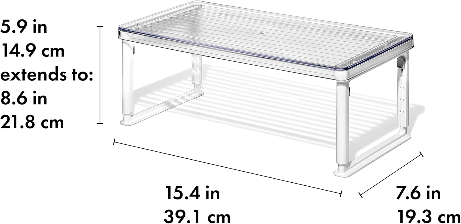 The OXO Good Grips Fridge Organization System is an extensive collection of bins, drawers, shelves, risers and accessories to help streamline your refrigerator. With five adjustable heights, our Adjustable Refrigerator Shelf Riser maximizes vertical space to add storage to any refrigerator. Produce, condiments and leftovers can be nestled on top of the shelf or tucked away below. Risers also help to elevate smaller items, such as jars and yogurt containers to keep them in sight, helping you keep track of inventory and expiration dates. The Shelf Riser has a 25 lb weight capacity and the shelf expands from 5.91 in to 8.68 in/15 cm to 22 cm.