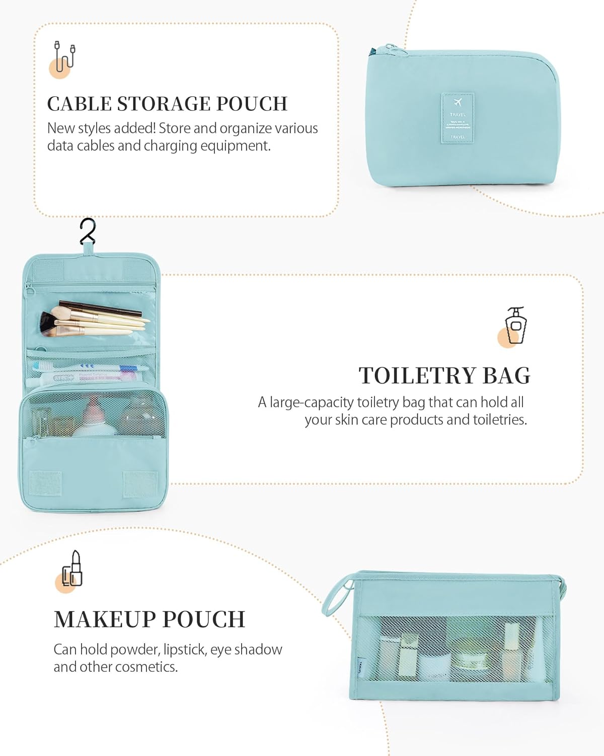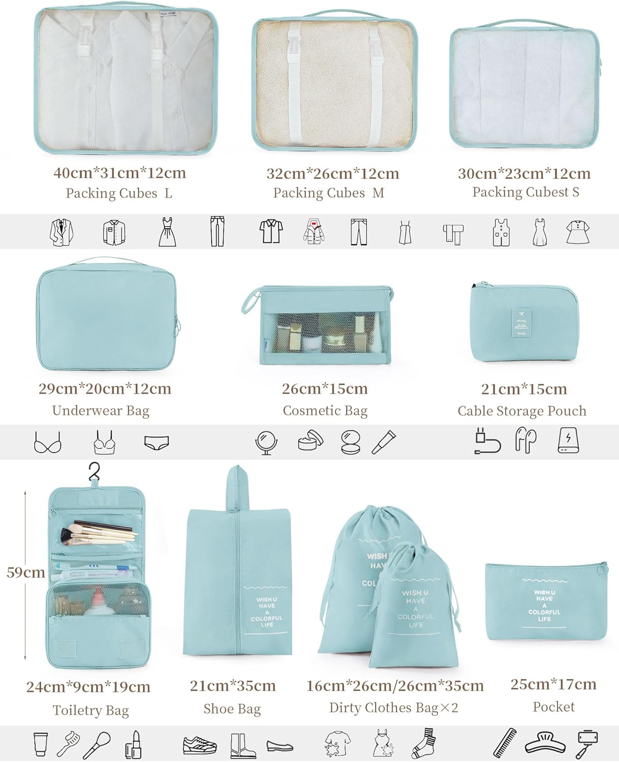 【MULTI-FUNCTIONAL PACKING CUBES 11pcs】Packing cubes for travel*3: L(15.8″ x 11.8″ x4.7″) M(12.6″x10.0″x4.7″) S(11.8″x8.9″x4.7″);bra underwear bag*1: (11.0″ x 7.8″ x 4.7″); laundry bag*2 – M(14″*10.6″) S (9.8″*6.3″);shoe bag*1: (13.4″x8.2″);toiletry bag with hook*1: (8.3″x7.5″x3.2″);pocket*1: (10.6″ x 6.2″);cosmetic bag*1: (10.2″*5.9″);Data cable bag*1:(9.8″*6.7″).