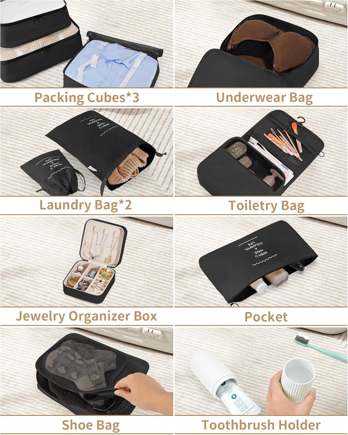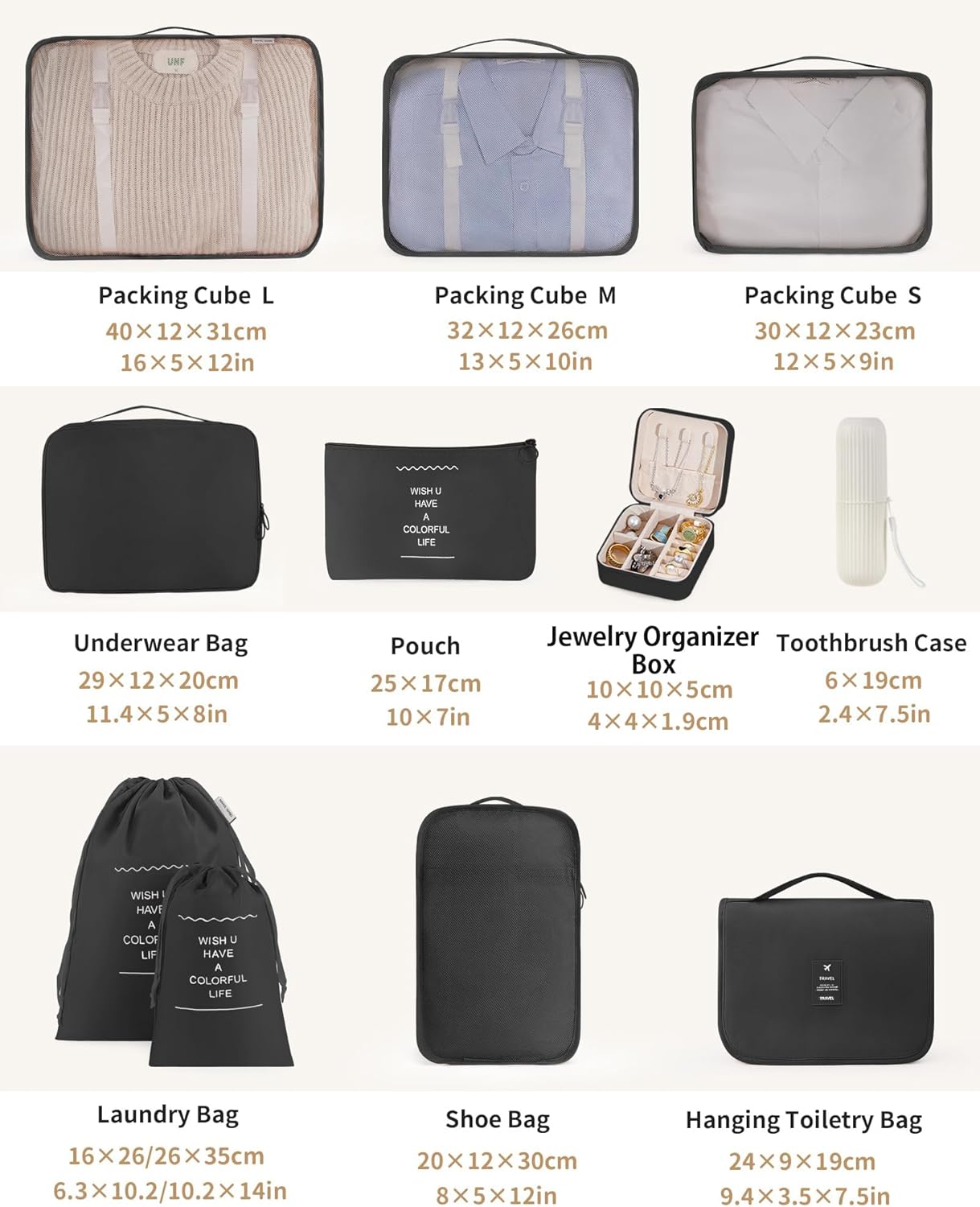 🛫【Multi-Functional Packing Cubes 11 Set】Packing Cubes * 3; Underwear Bag * 1; Laundry Bag * 2; Upgraded Shoe Bag * 1; Hanging Toiletry Bag * 1; Waterproof Pouch * 1; Jewelry Organizer Box * 1; Travel Toothbrush Holder * 1. Large capacity must-have value pack.