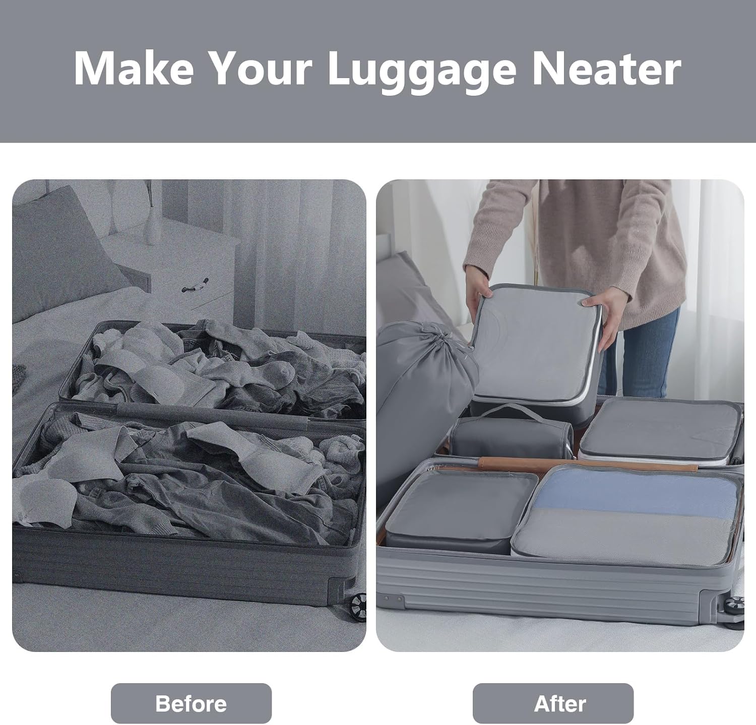 Convenient Space-Saver: Packing clothes with travel cubes maximizes space utilization. The travel bags organizer for luggage tightly wrap each garment, reducing friction and keeping clothes smooth.Transparent mesh allows easy access to specific items, you can effortlessly locate your desired outfit without rummaging through your entire suitcase