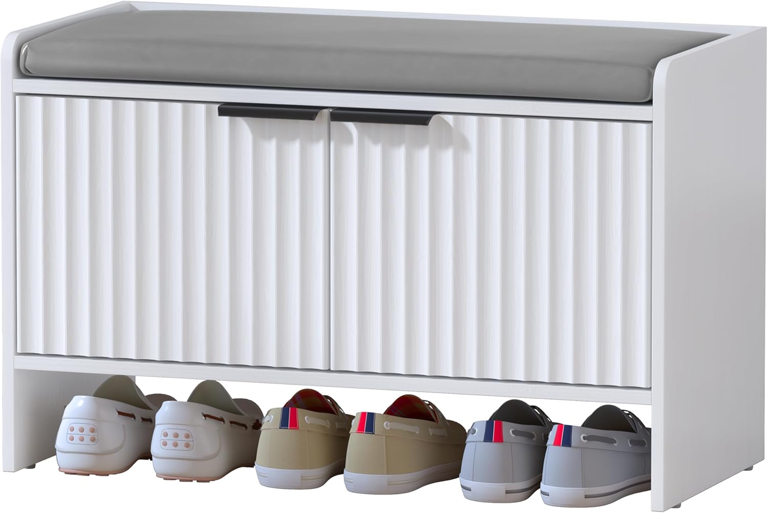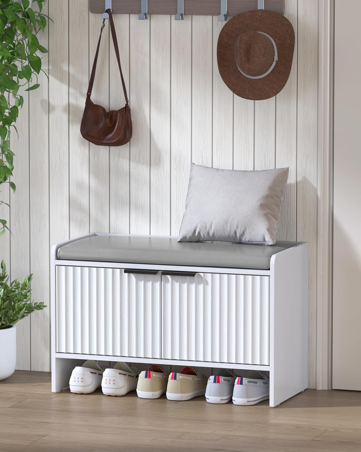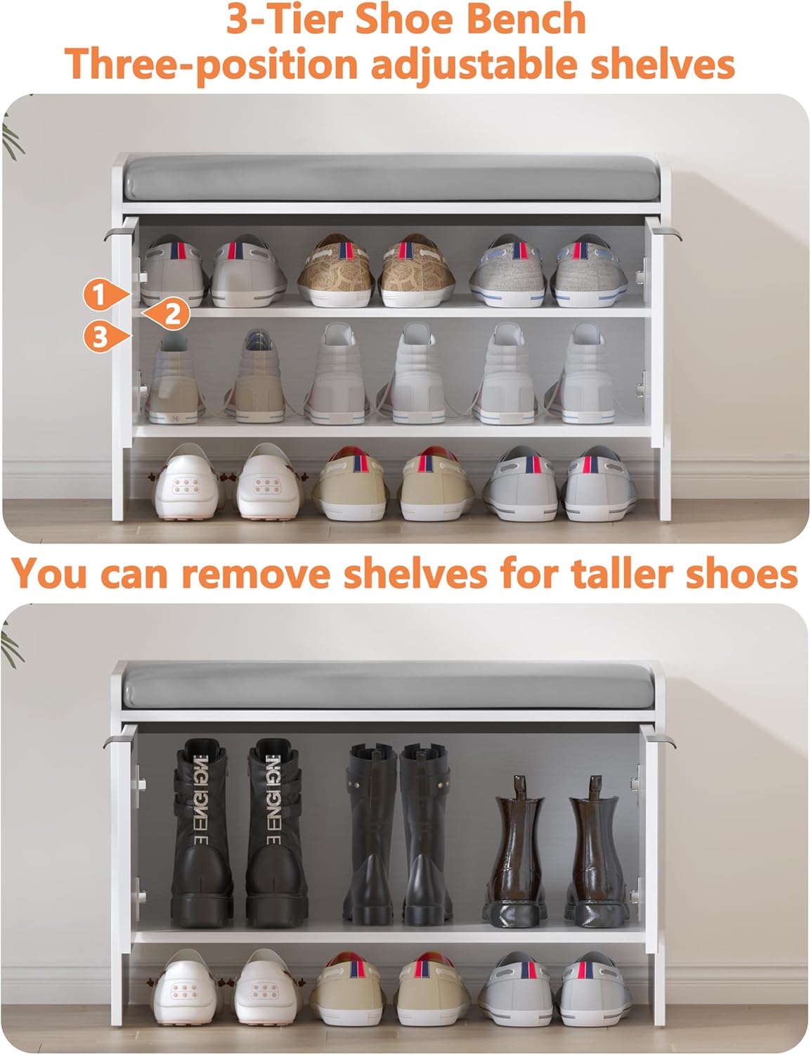 Piskyet Modern Shoe Bench,Entryway Bench Storage with Padded Seat Cushion,Adjustable Shelf,Shoe Storage Bench for Entryway,Living Room,Bedroom,White
