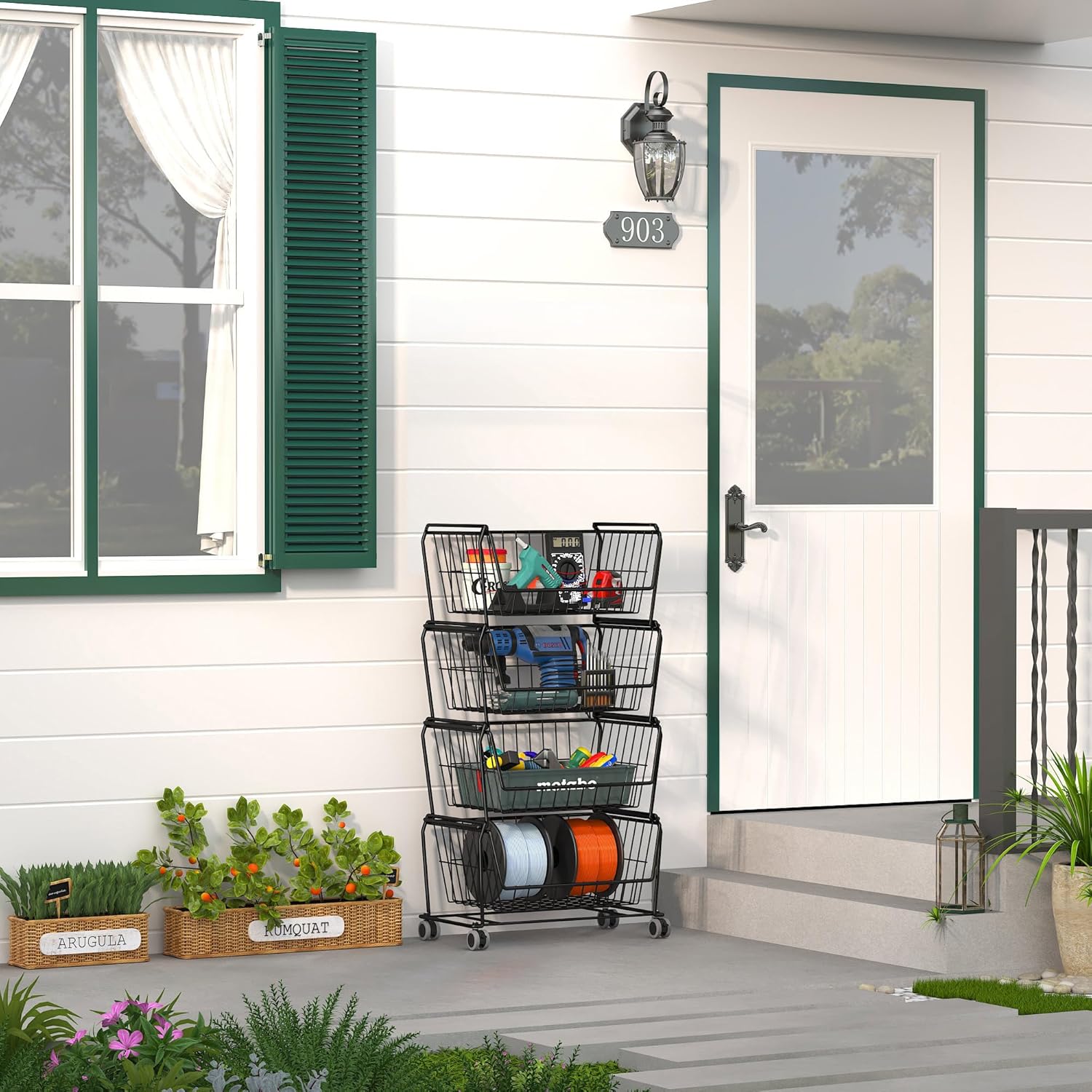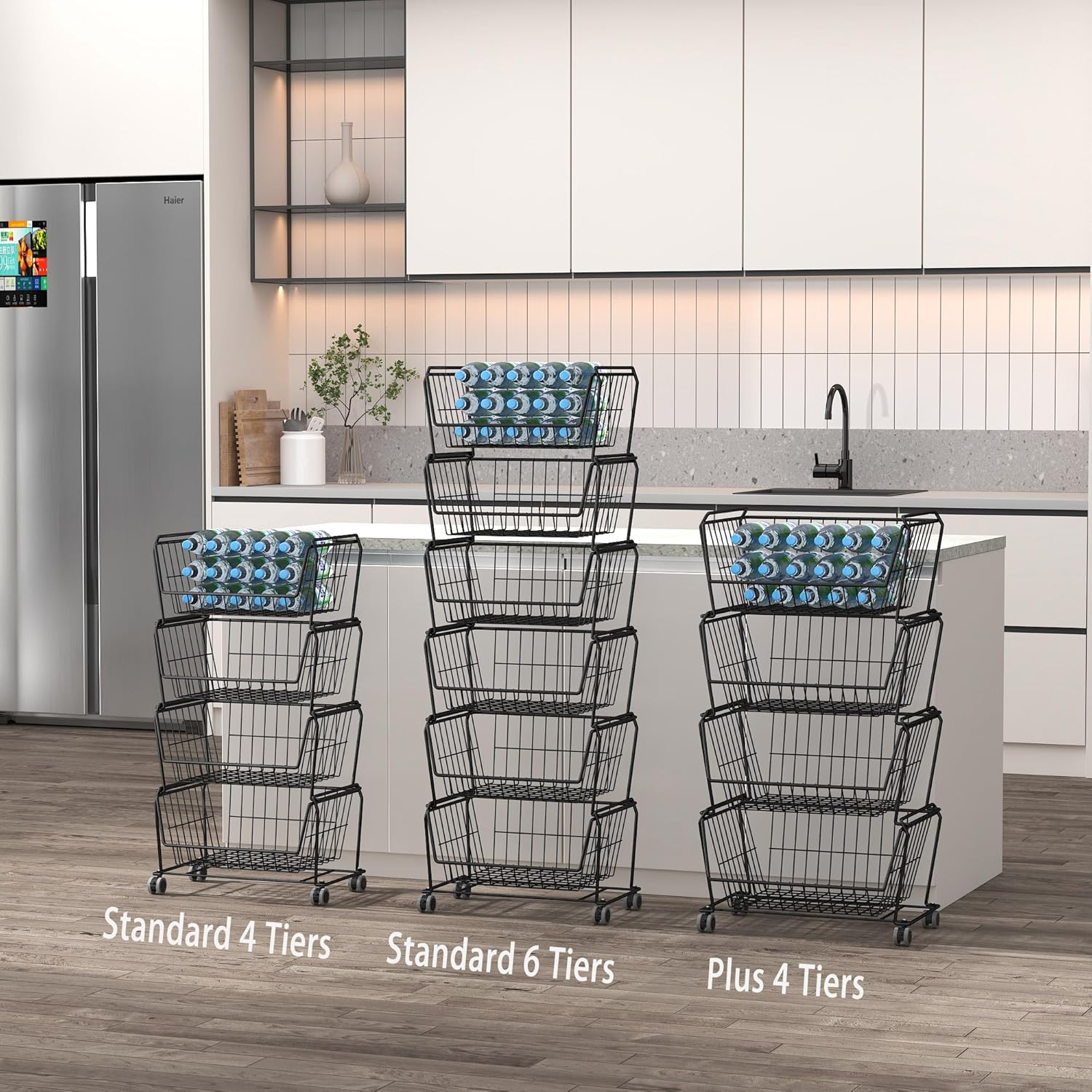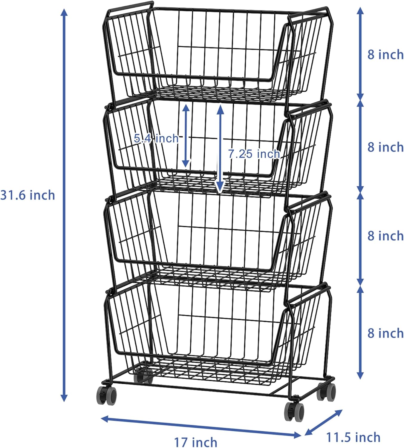 【Suitable Capacity】Each individual basket size: L17”x W11.5”x H8”, 4 tier storage rack set (wheels included) size: L17”x W11.5”x H31.6”. Enough space with open design, this metal storage basket rack allows for visible storaging, convenient for sorting, you can put in or find out your item very easy in the basket. A perfect storage/space save solution for your home, kitchen, pantry closet, bedroom, bathroom, office, laundry rooms, craft rooms, playrooms garage and so on