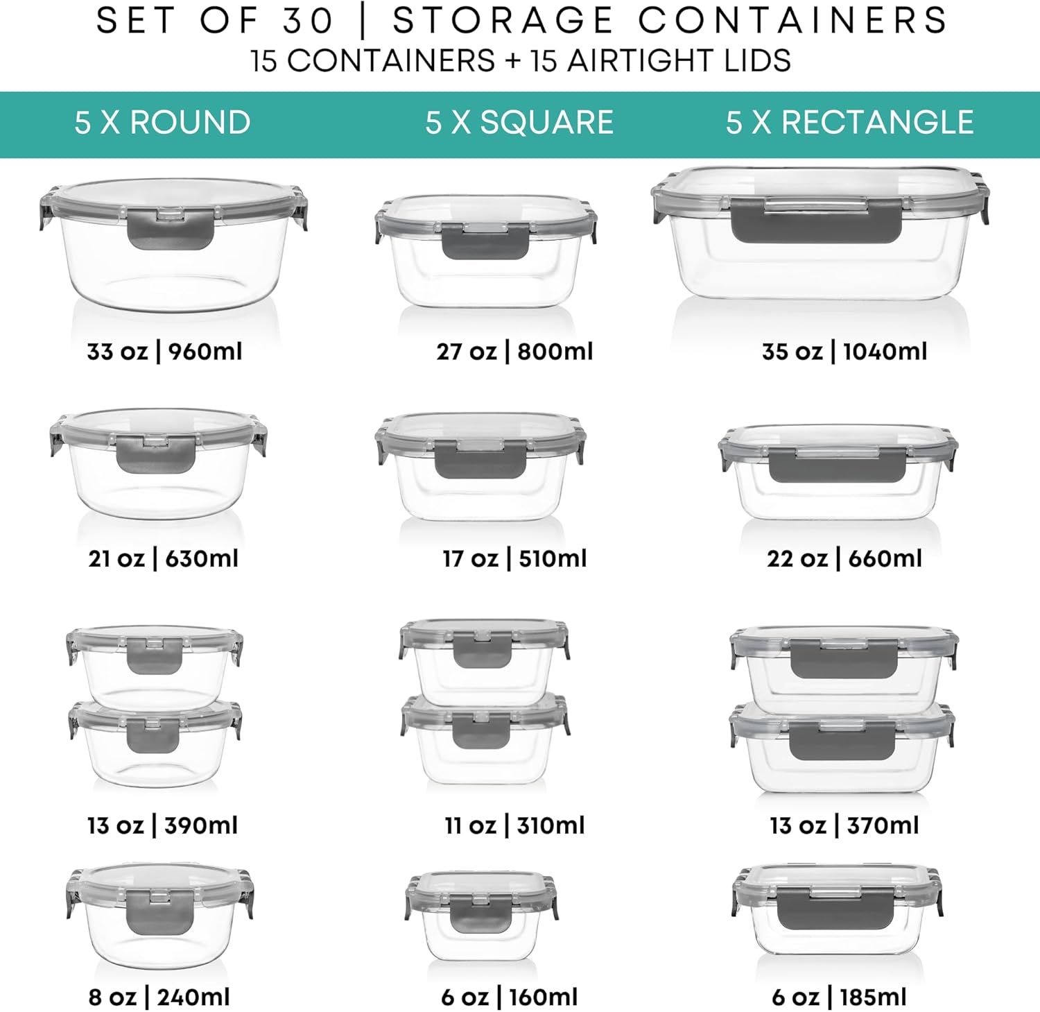 【High Quality – Comprehensive Set】Includes 30 glass storage containers with lids in various shapes and sizes: Rectangular (1040ml / 35 oz, 660ml / 22 oz, 370ml / 13 oz, 185ml / 6 oz), Square (800ml / 27 oz, 510ml / 17 oz, 310ml / 11 oz, 160ml / 6 oz), and Round (960ml / 33 oz, 630ml / 21 oz, 390ml / 13 oz, 240ml / 8 oz). Perfect for meal prep, food storage, and organizing your pantry