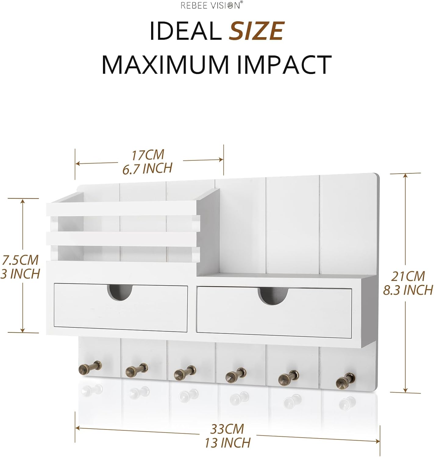 Rebee Vision Decorative Key Holder Wall Mount for Home Decor – Mail Holder with 2 Drawer Organizer and 6 Key Hooks – Home Organization for Aesthetic Room Decor (White)