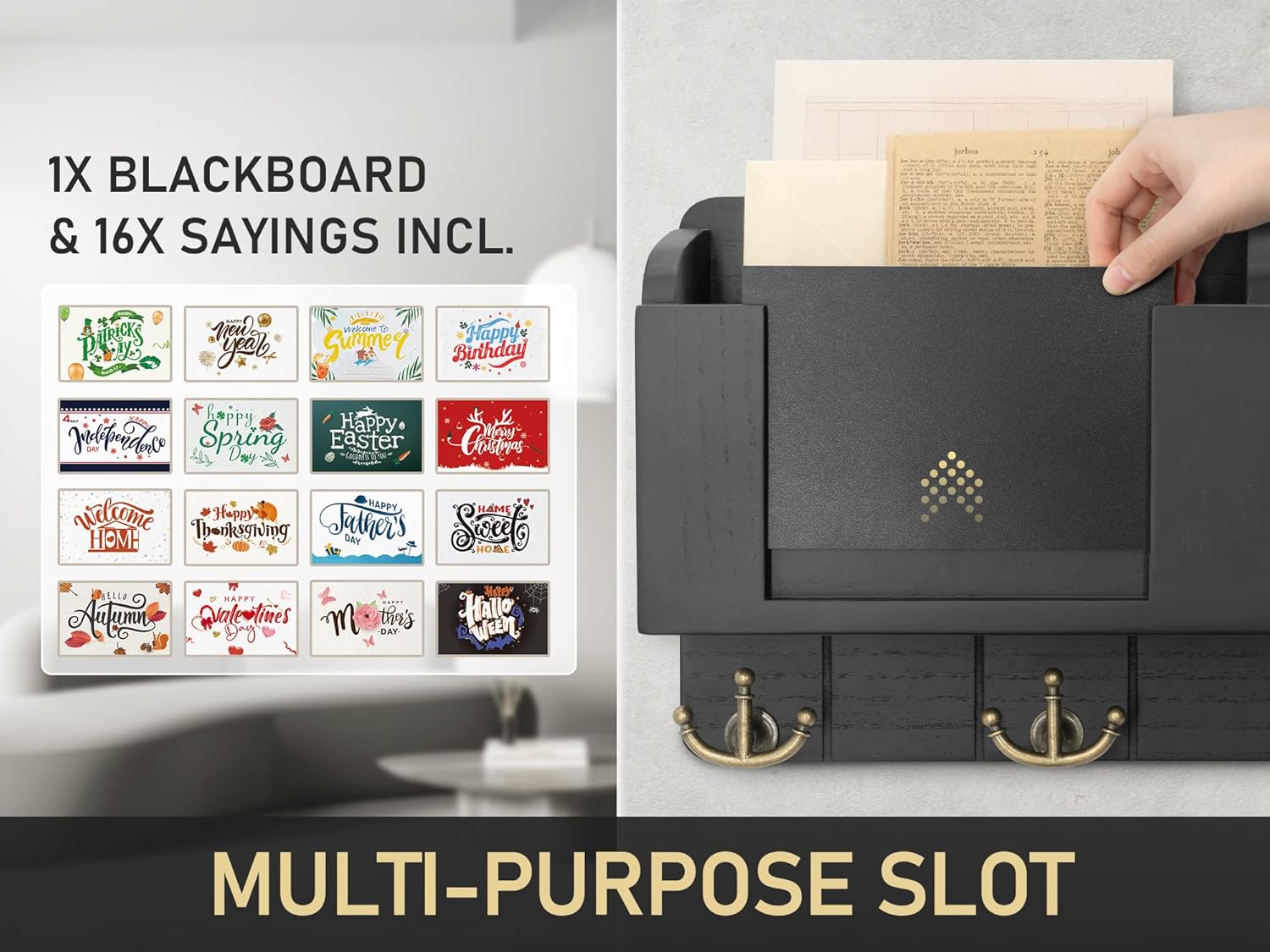 [FLEXIBLE DISPLAY SLOT] Transform your space with this key and mail holder featuring a 6 x 4-inch card slot, perfect for your favorite photos or notes that enhances room decor ! The movable chalkboard is ideal for quick reminders or fun messages. Also, it comes with 8 double-sided holiday cards to add a festive touch to your home organization!