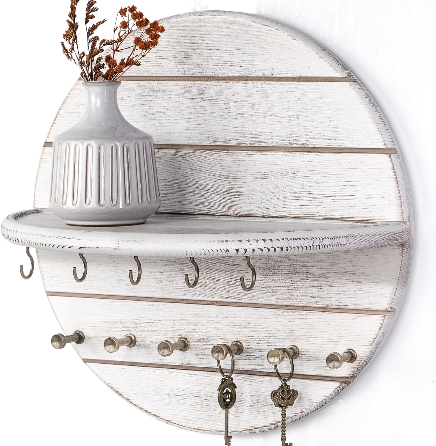[ELEGANT FARMHOUSE TOUCH] Bring charm into your space with this old white key chain holder wall mount! Its soft creamy finish and round silhouette blend perfectly with modern farmhouse wall decor. The smooth pine surface and delicate edges make it a cozy accent for your living room decor, adding a bright, airy vibe to your home
