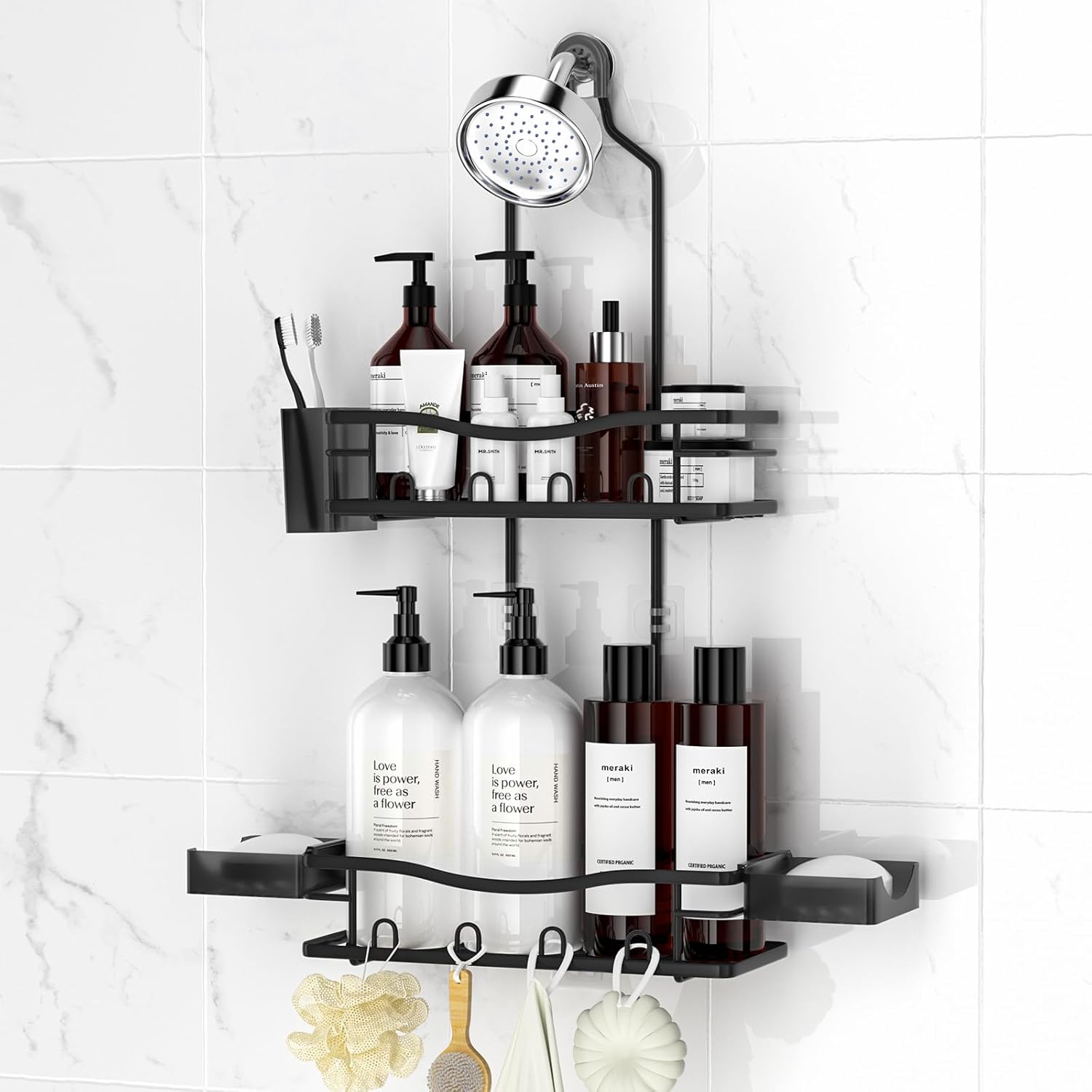 【RUSTPROOF & WATERPROOF – BUILT TO LAST IN HUMID BATHROOMS】Crafted from premium 304 stainless steel, the black shower caddy over shower head can resist rust and water damage. The durable design of the shower organizer hanging is perfect for the humid bathroom environment, making it long-lasting and highly reliable. Unlike plastic alternatives, the stainless steel material ensures that the shower organizer maintains its integrity and appearance over time, even with frequent exposure to water and steam.