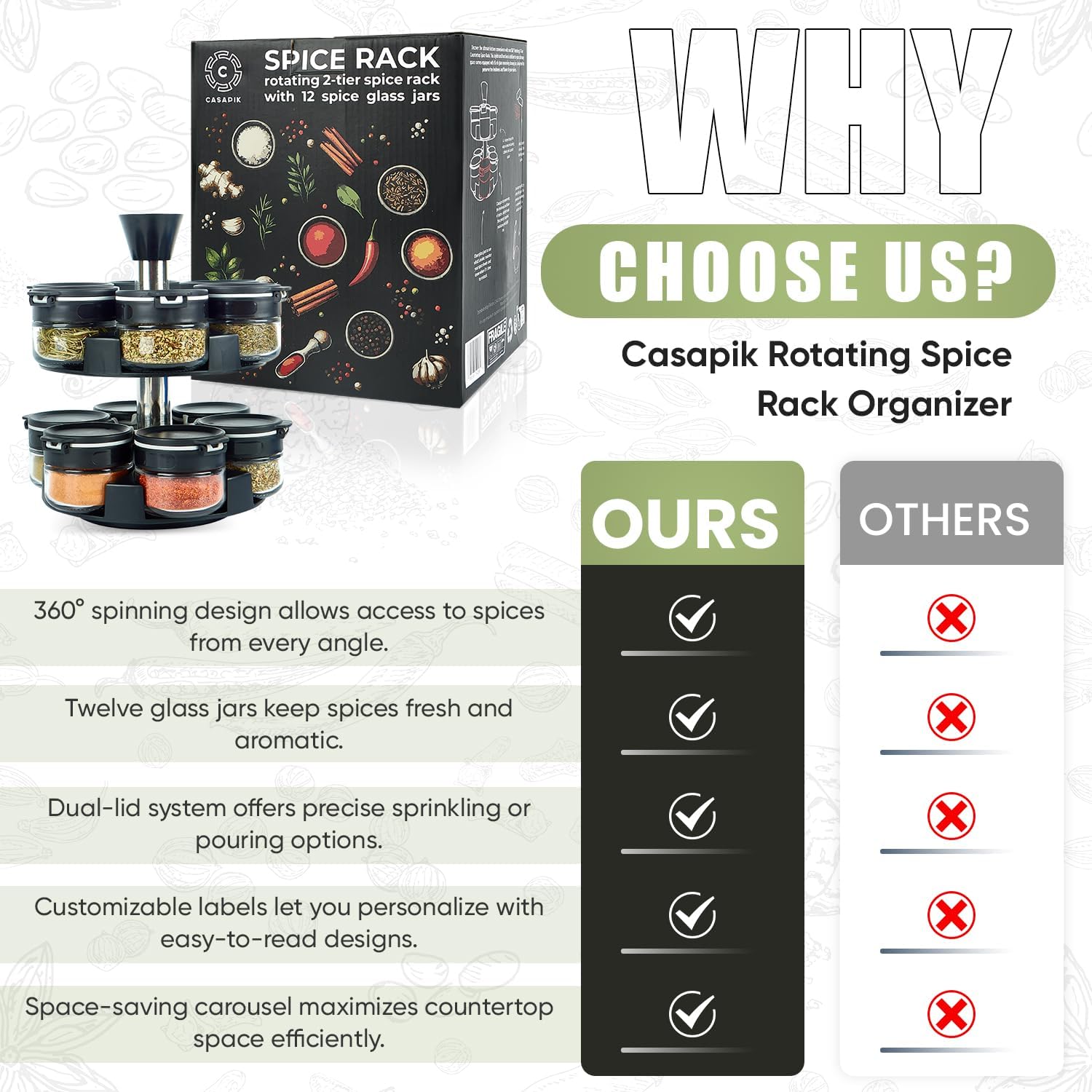 FLAVOR FRESHNESS – Glass Jars that lock in aroma and taste, never settle for dull flavors! The revolving spice rack comes with 12 glass jars designed to keep your spices fresh, preserving their aroma and taste for flavorful cooking.