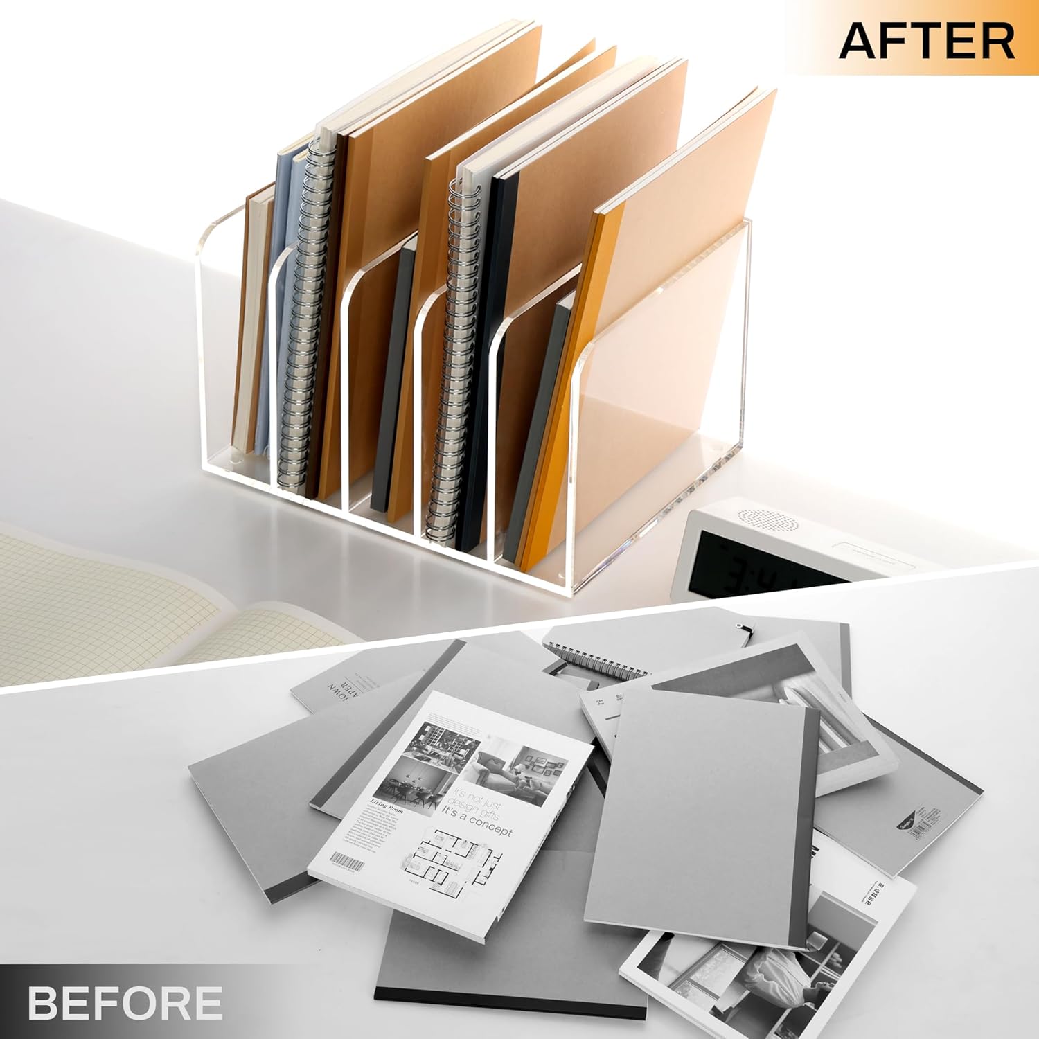 SANRUI Acrylic File Organizer, Clear Magazine File Holder Desk Organizer for Office Organization and Storage with 5 Vertical Compartments, Desktop Bookshelf for Home Office Organization