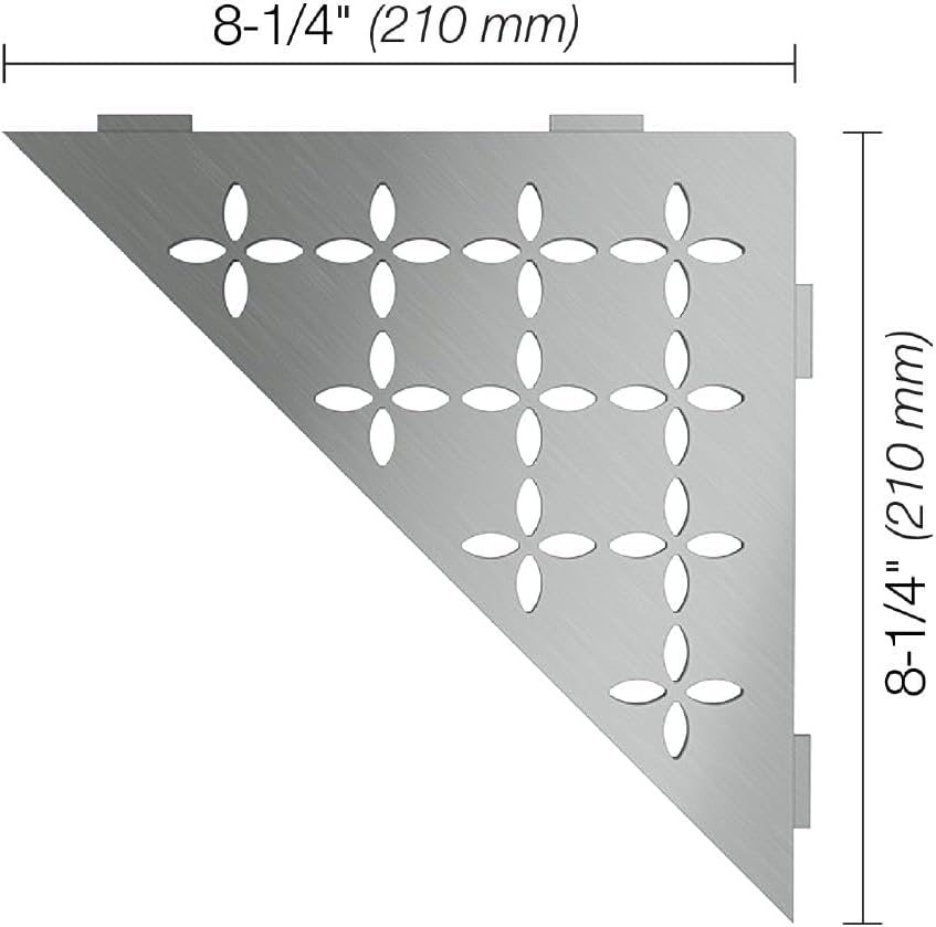 Schluter Triangular Corner Shelf for Tiled Walls – Floral Design, Stainless Steel Material, Brushed Stainless Steel Finish, 3/32″ Thick Anchoring Tabs – SES1D5EB