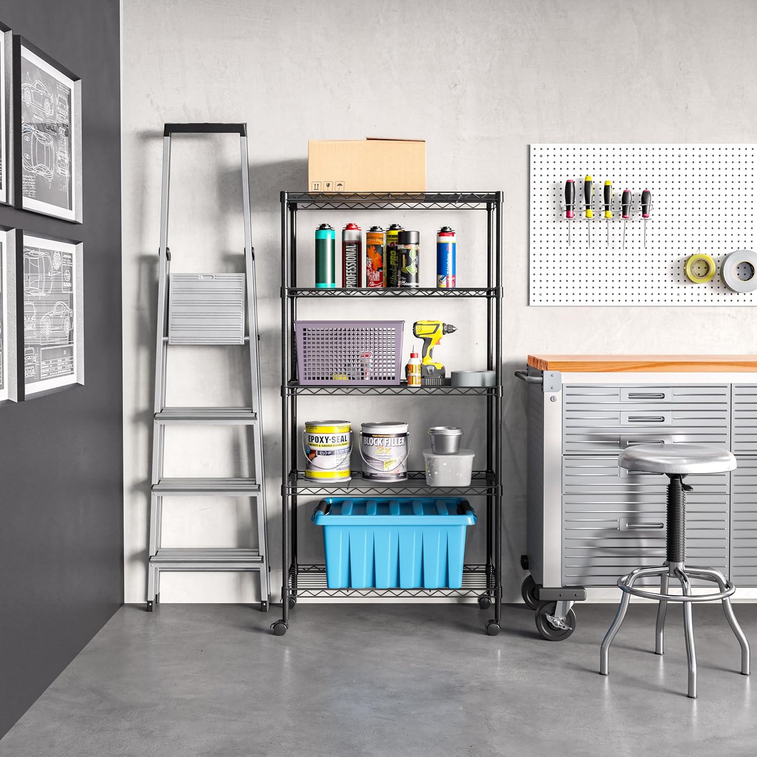 Organize your home or office with Seville Classics’ 5-Tier Wire Shelving System. This system is constructed from industrial-strength steel and features a black epoxy powder-coat finish which provides the same corrosion resistance to chrome plating. These shelves are perfect for adding extra storage around the house, tidying garages, and organizing office spaces. Assemble with the screw-in leveling feet for a high-capacity storage solution. Unit features industrial-strength steel wire construction for multipurpose storage. Black finish provides necessary corrosion resistance in dry environments. Casters allow for easy positioning in the kitchen, garage, or office Shelves adjust at 1″ increments Includes leveling feet No tools required for assembly Limited 10-year Specifications Dimensions: 30″ W x 14″ D x 60″ H Capacity on leveling feet: 300 lbs. per shelf Total system capacity on leveling feet: 1500 lbs. Weight: 28. 5 lbs. Model #: WEB675