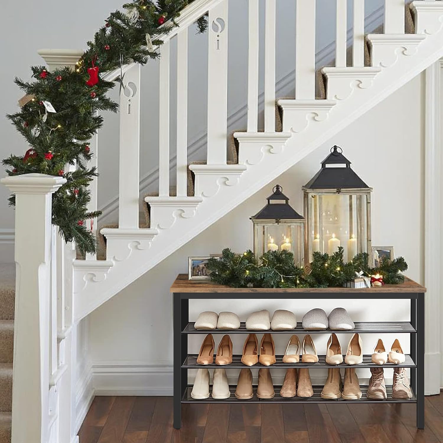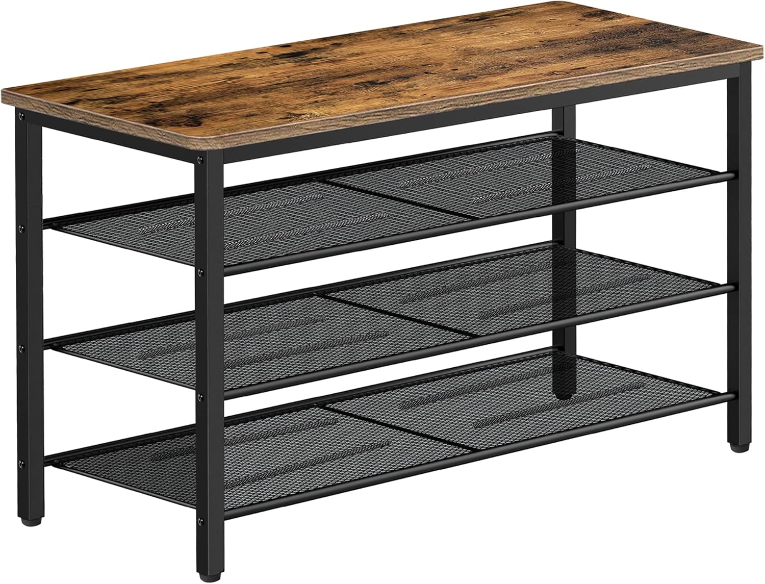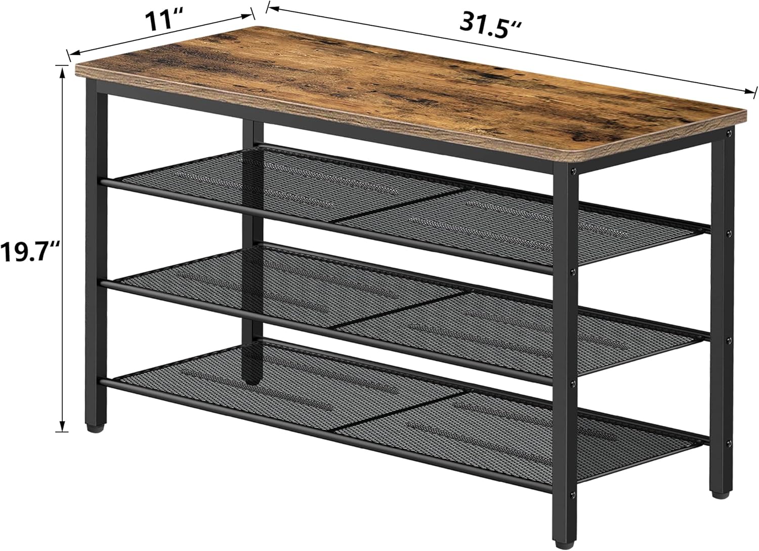 Shoe Bench, 4-Tier Shoe Rack 31.5”, Storage Entry Bench with Mesh Shelves Wood Seat, for Entryway, Hallway, Living Room, Stable Metal Frame and Easy Assembly, Rustic Brown SB01BB016