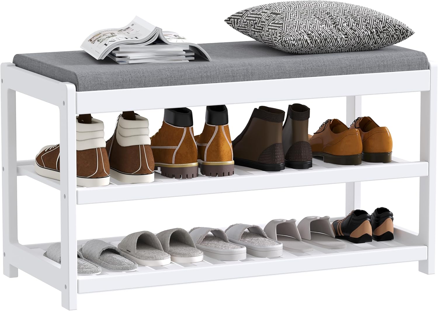 Shoe Bench Entryway, 100% Solid Solid Wood Shoe Rack Bench with Storage and Cushion Padded Seat, 3-Tier Shoe Organizer for Hallway Living Room, Mudrooms, White