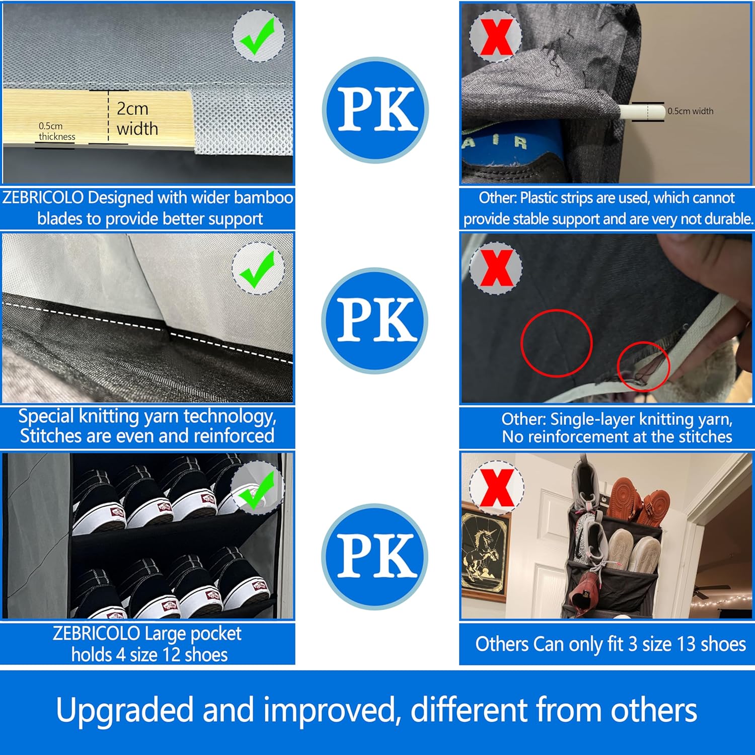 【New upgraded bamboo material】Bamboo has the function of enhancing air freshness and strong air permeability. We embed a piece of bamboo board in each layer of baffles, and also fix the shoe organizer, so that the whole is stable and does not deform. ultra strong, 10 Tier door shoe organizer can hold up to 70 pounds of weight; designed for long lasting use, features durable non woven fabric and thick rip and tear resistant stitching,and the overall construction feels sturdy and well-made