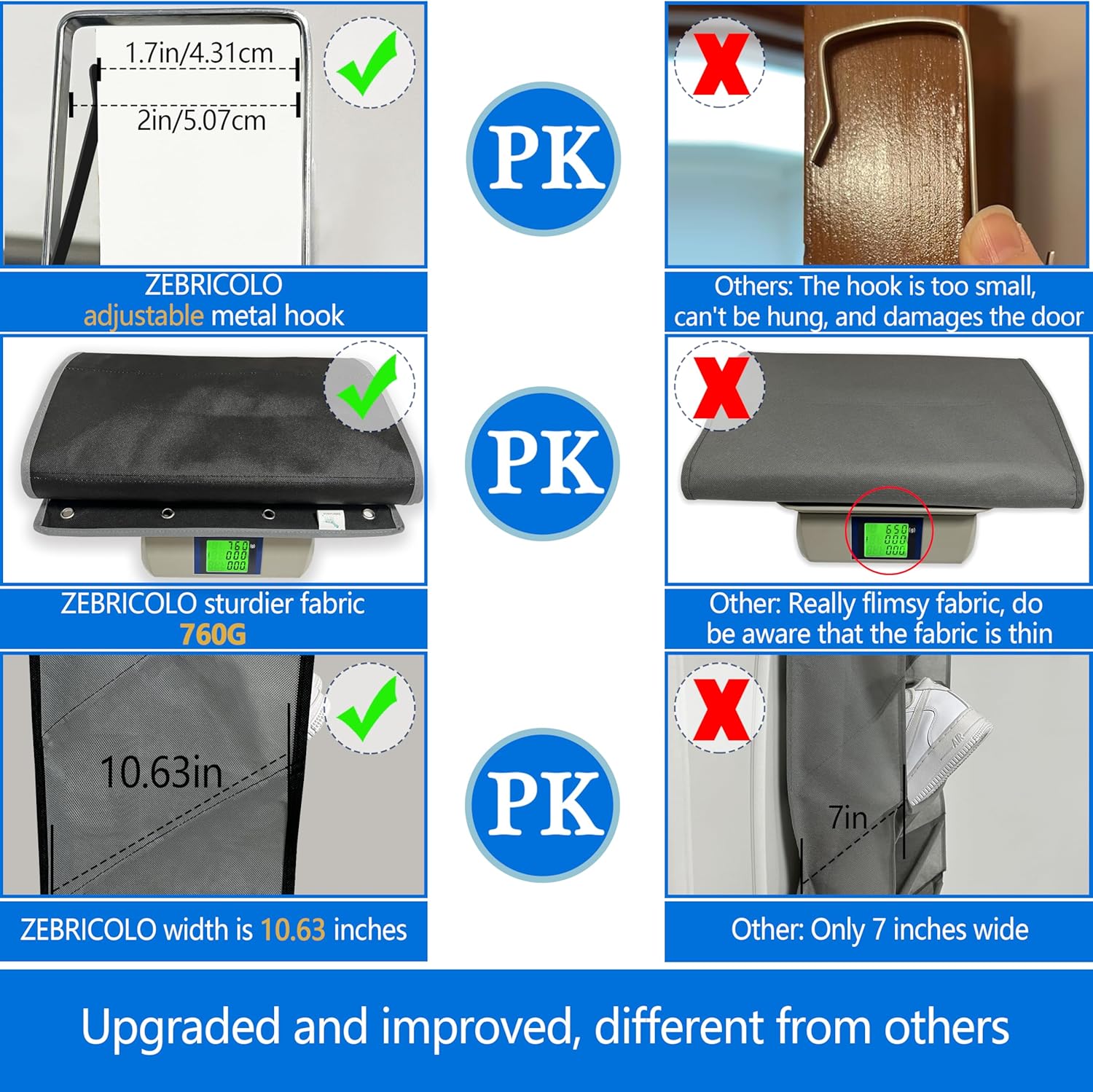 【shoe organizer,Upgrade Large pocket】measures 74 by 17 inches , Each pocket is a great size—7″ H, 17″ W, and 10.63″ D—so they’re roomy enough The 10.63” depth is enough to hold size 7-13 shoes and you could put two pairs of size 11 sneakers or tennis shoes together even could hold size 13 boots without sagging or stretching, a superior choice for storing nearly anything,and it has been a game-changer for you closet organization! over the door shoe organizer