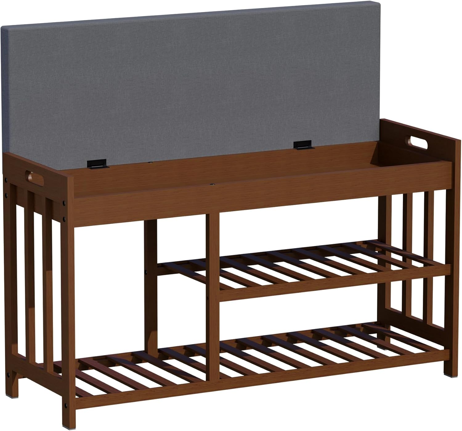 Shoe Rack Bench with Cushion,2 Tiers Shoe Bench with Flip-Top Storage,Wood Shoe Rack for Entryway, Hallway, Bedroom, Front Door Entrance (Brown)