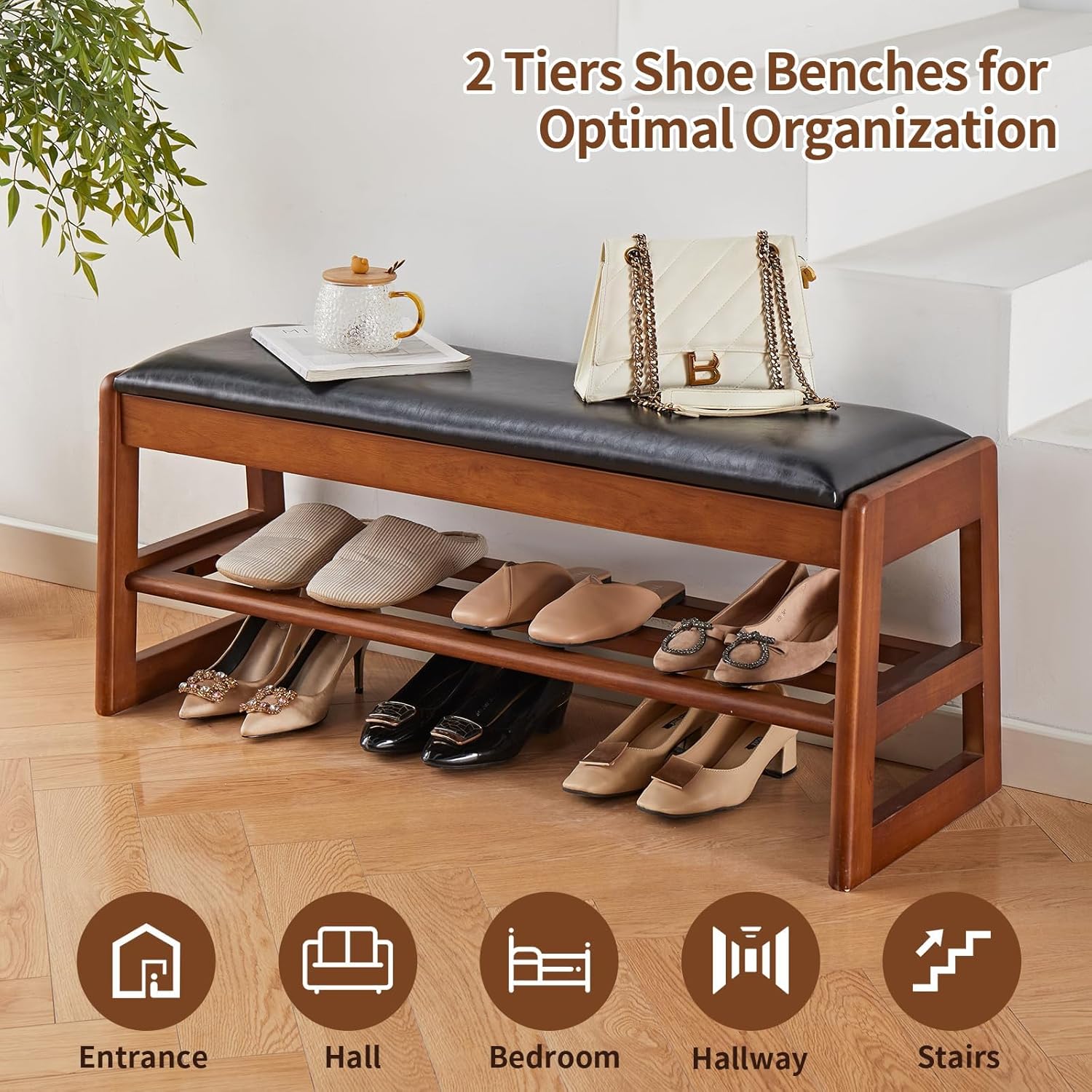 Shoe Rack Bench with Storage – Entryway Bench 40inch 2-Tier Shoe Bench with PU Cushion, Solid Wood Legs Flip Top Entryway Organizer Space Saving