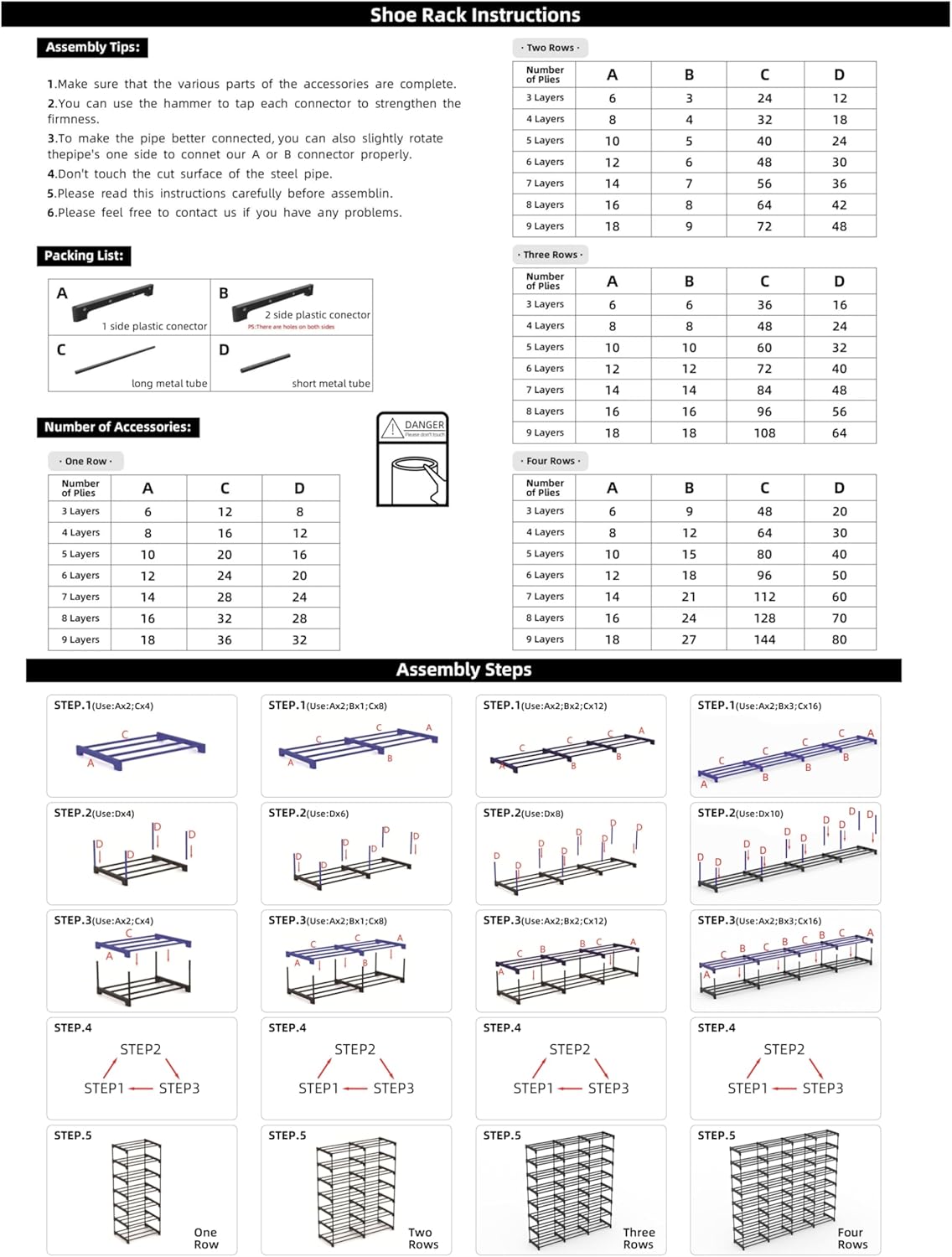 Durable Material: Made with high-quality, durable metal tube and plastic conector, this 4 rows 8 tiers shoe organizer is built to last and protect your footwear from damage. The metal rod with plastic conector ensures the shoe rack’s stability and sturdiness, making it capable of supporting even the heaviest shoes and boots